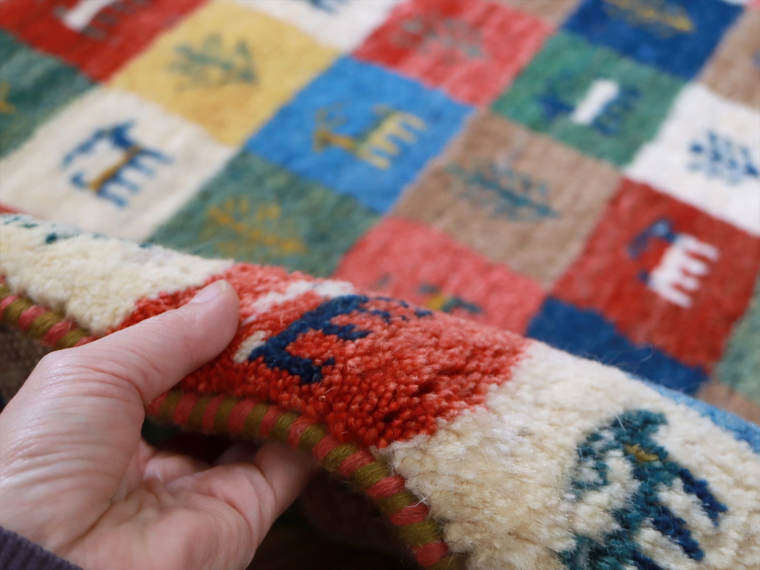 毛足が長く、パイルを含めたギャッベ全体の厚みは2.2-2.3cm程度。ボリューム感たっぷりのふかふかギャッベです。