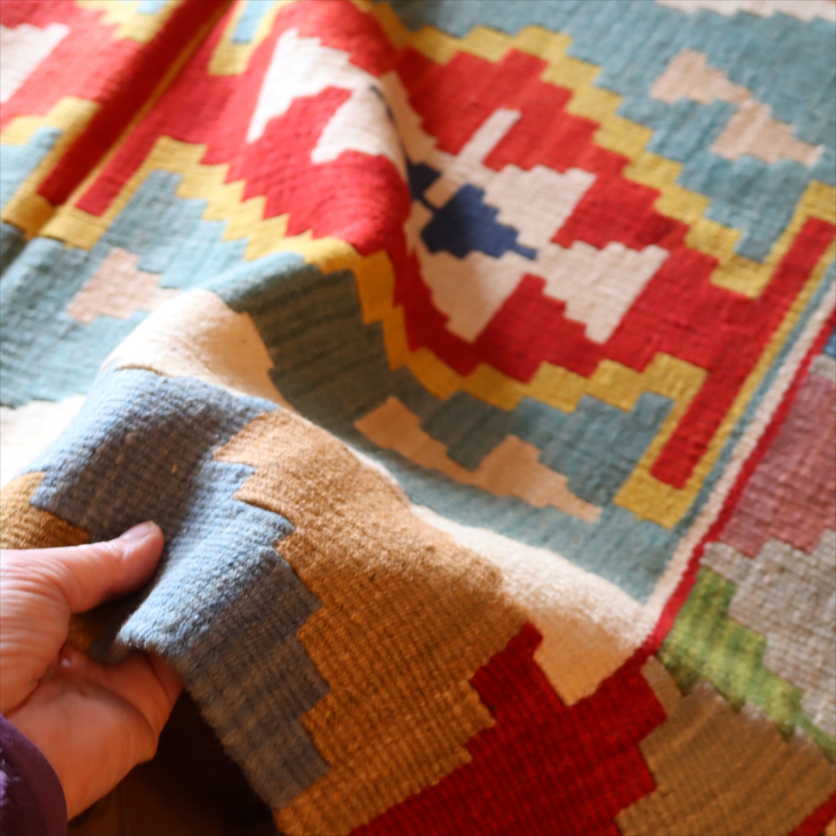 織り地がしなやかでやわらかいのがカイセリキリムの特徴です。やや厚みがあり、やさしい肌触り。色の切り替え部分には、キリムの織りの特徴で、縦に隙間が開いています(スリットと呼んでいます)。