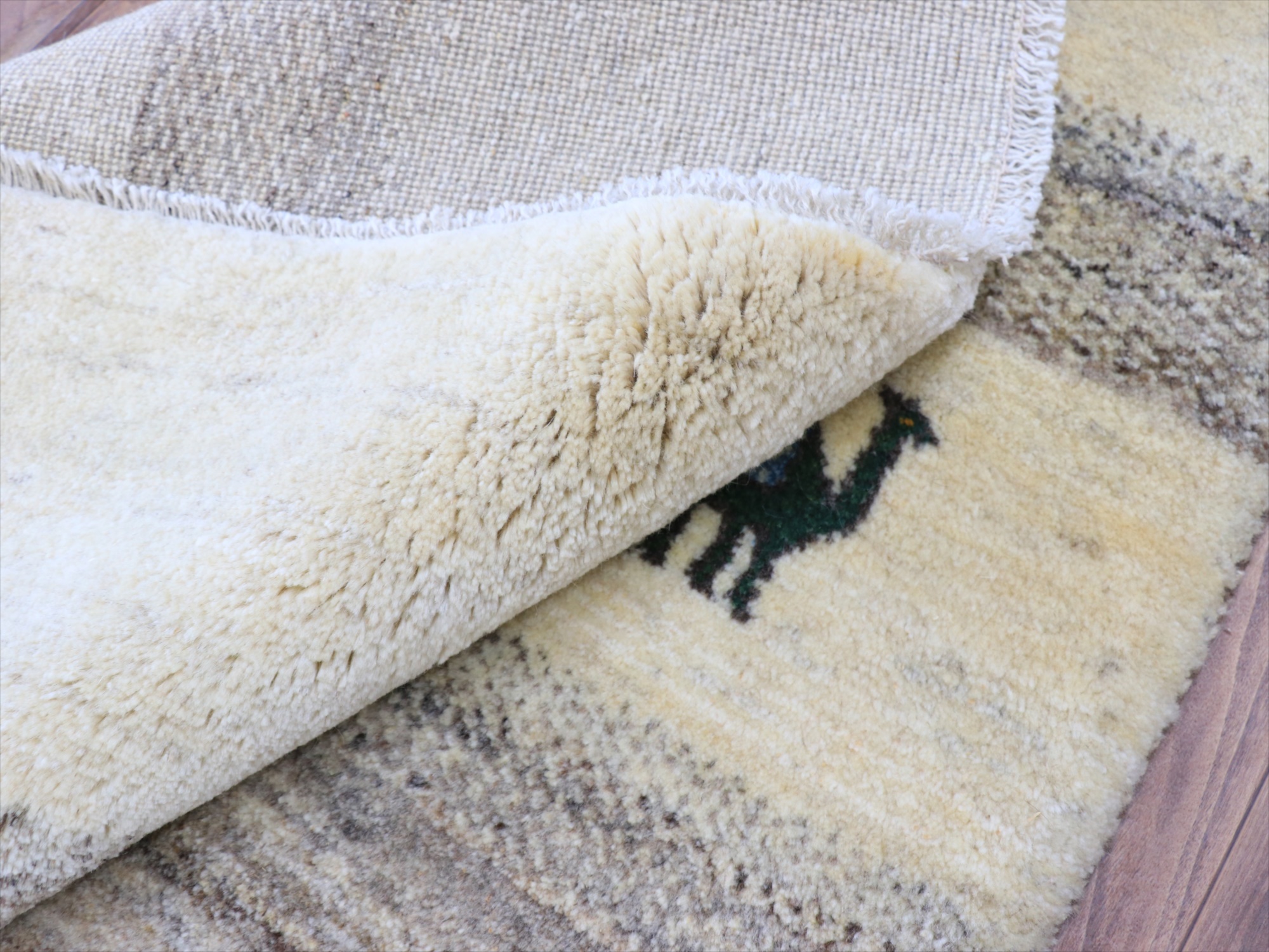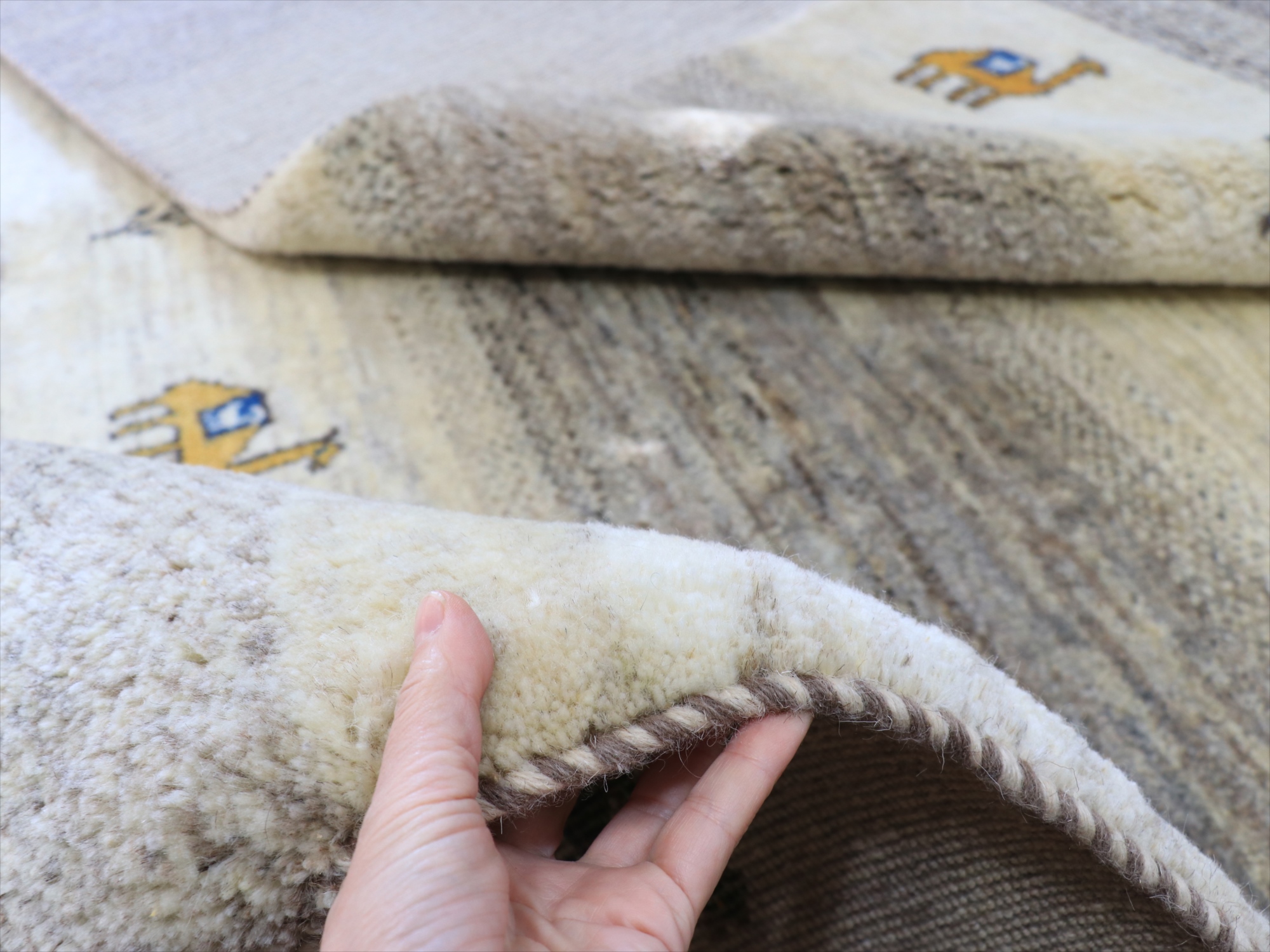 毛足が長くボリュームあるふっくらとした織り地のギャッベ。パイル(毛足)を含めた厚みは2.3-2.4cmほどで、分厚いという表現がぴったりの手織り絨毯です。