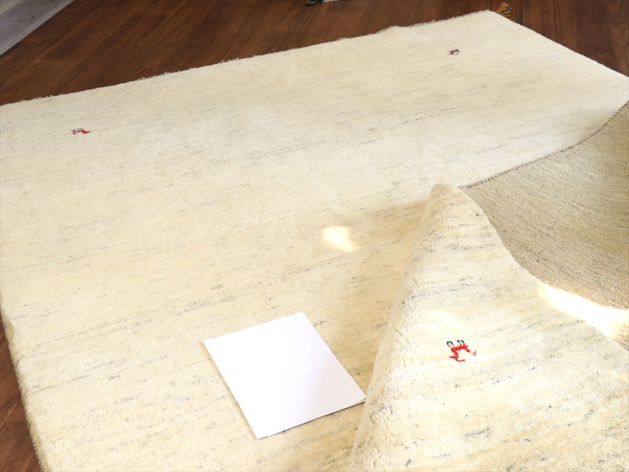 羊毛の自然な色味を活かして織られたシンプルデザインのギャッベ。当店ではナチュラルアイボリーと表記していいます。いわゆる白い羊の色ですが、真っ白ではなく、黄色みのあるベージュがベースになっています。参考になるように、白いコピー用紙を一緒に撮影しました。このピースは、全体的に、羊毛のグレーやベージュが混ざっていて、自然な感じの色ムラができています。正面から見て、左上のほうはグレーっぽい毛糸が少し多めに混ざっています。