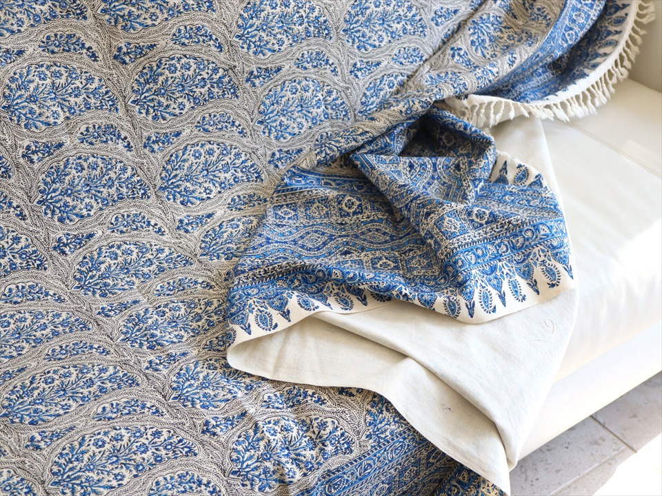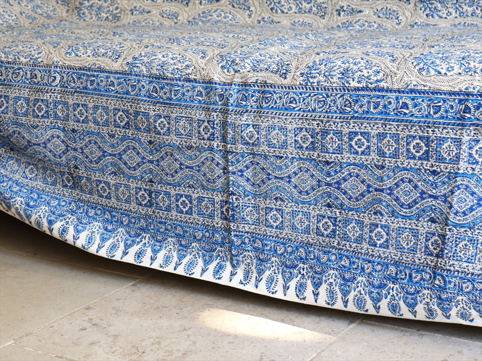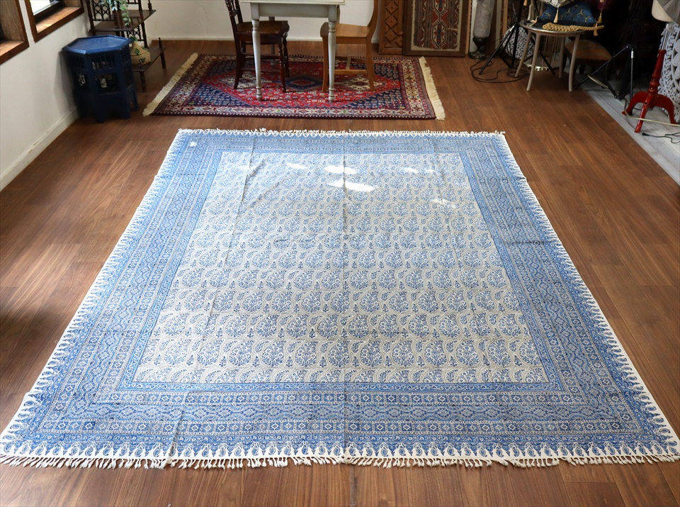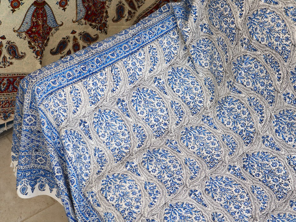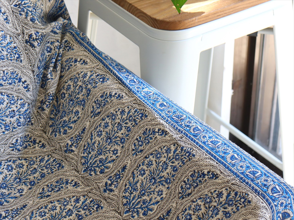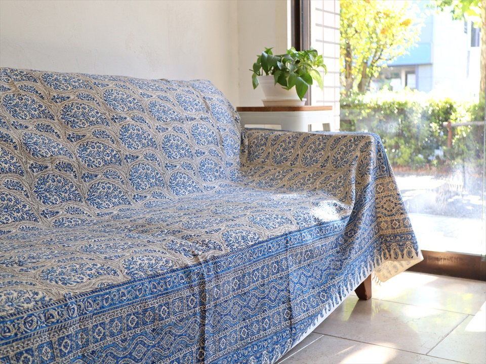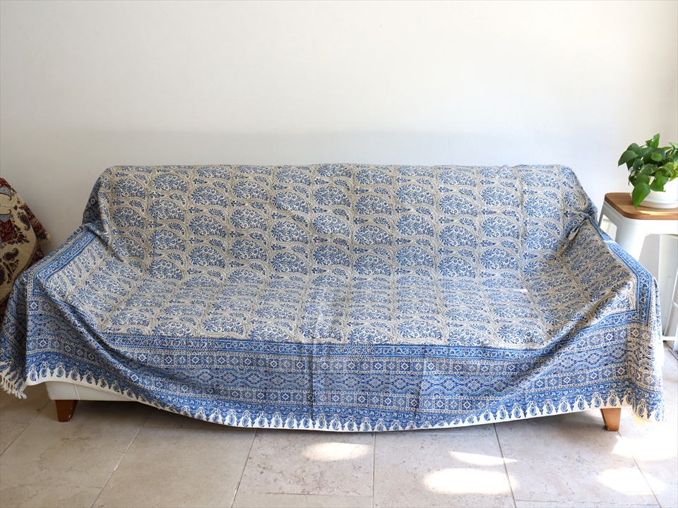 ペルシャ更紗 イラン手染め布 265x208cm ブルー アンティークデザイン ソファーカバー ベッドカバー