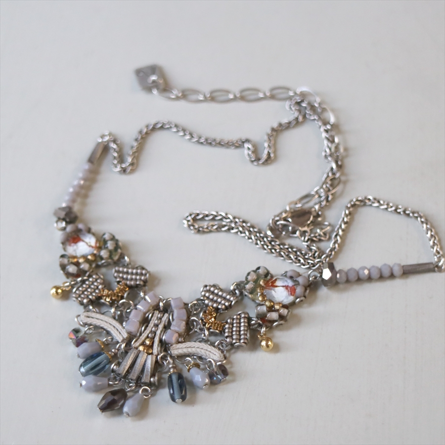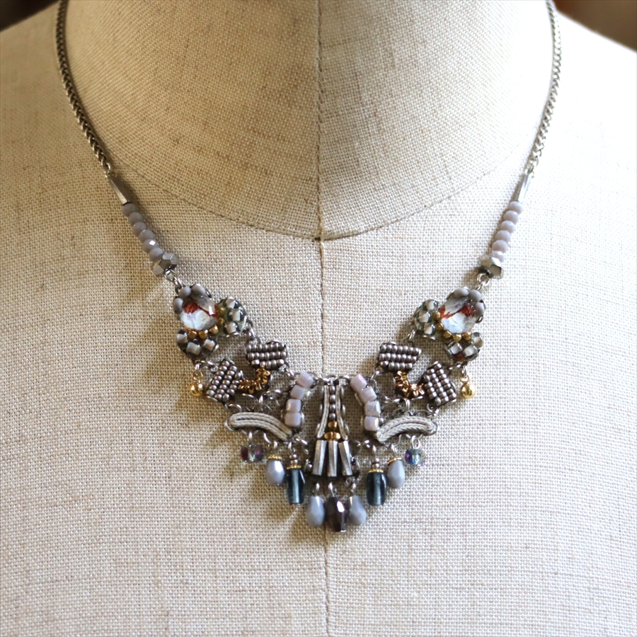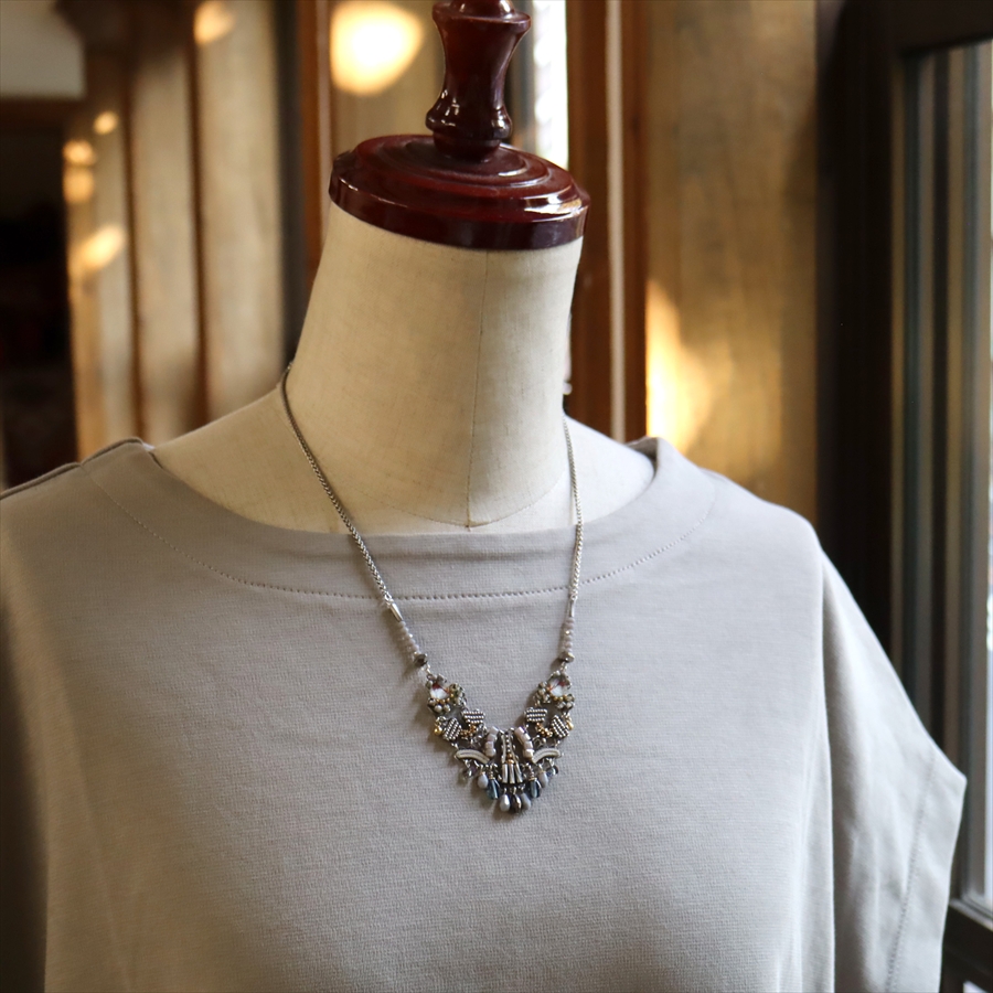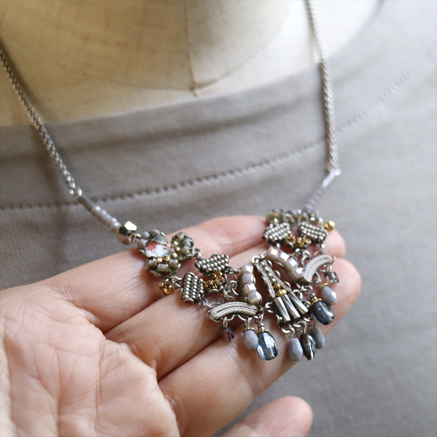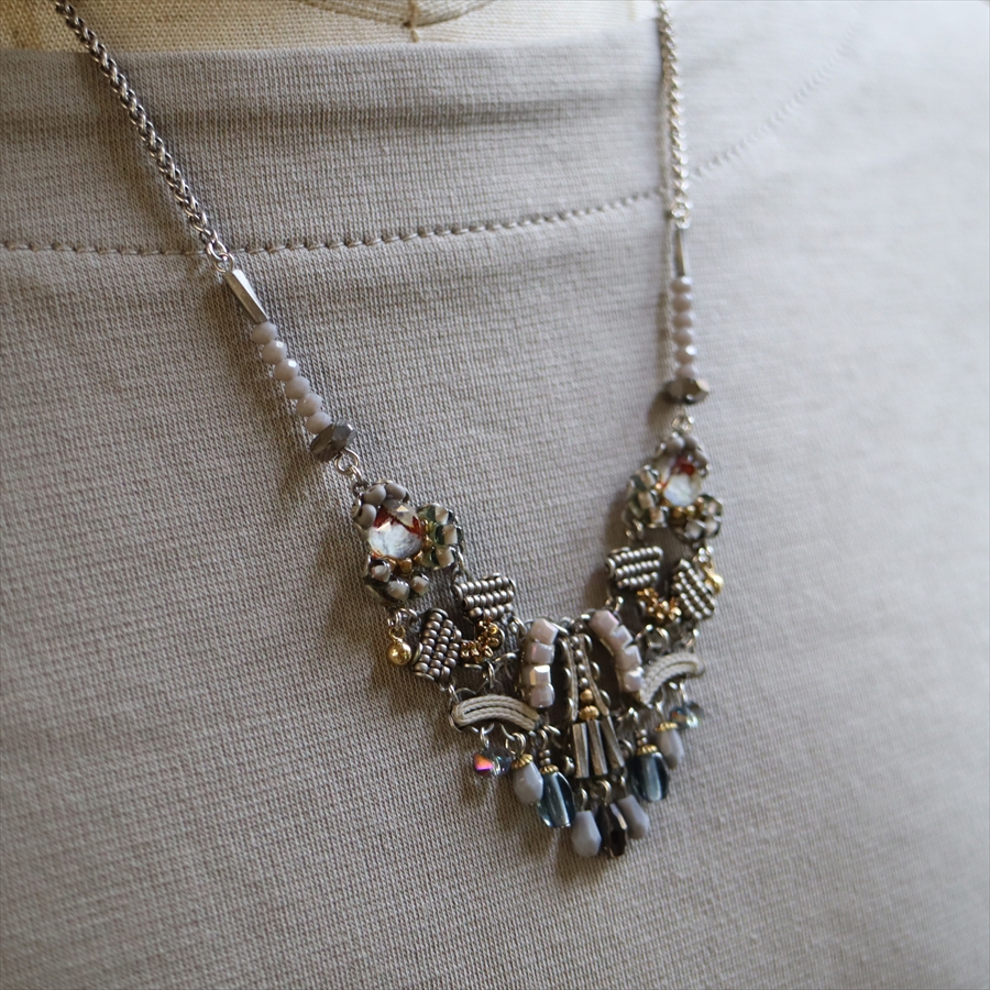 淡い銀白色のロマンティックな雰囲気のShivering Moonlightという名のシリーズ。繊細なビーズパーツが揺れる優し気な印象のネックレスです。