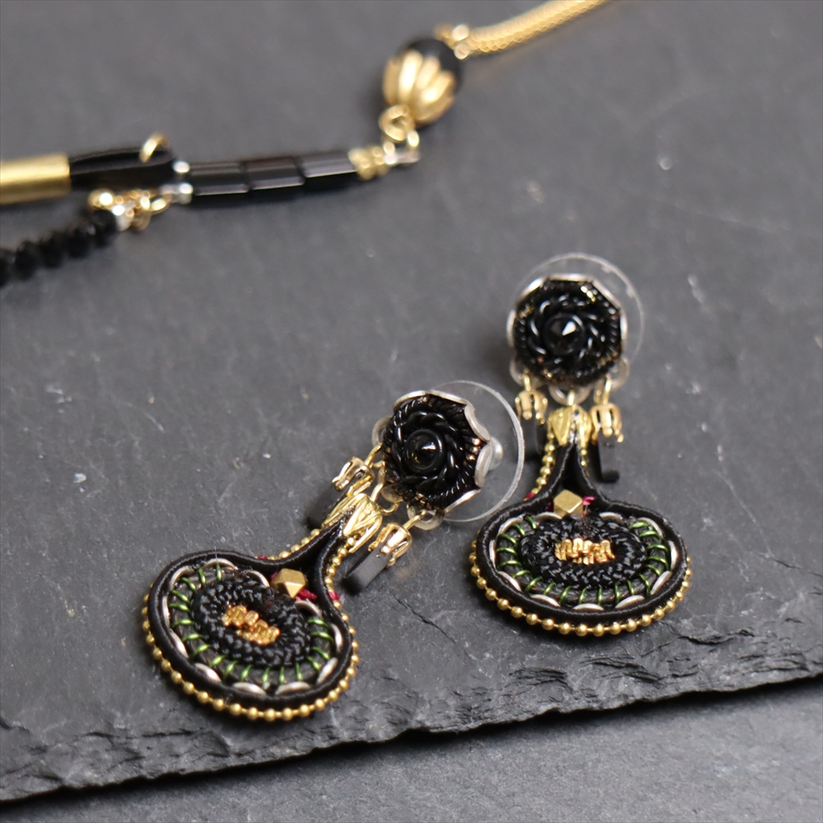 きらめくブラックビーズと艶をおさえたゴールドの融合が印象的な、Gilded Blackという名のシリーズ。細やかなパーツが施された上品なデザインです。