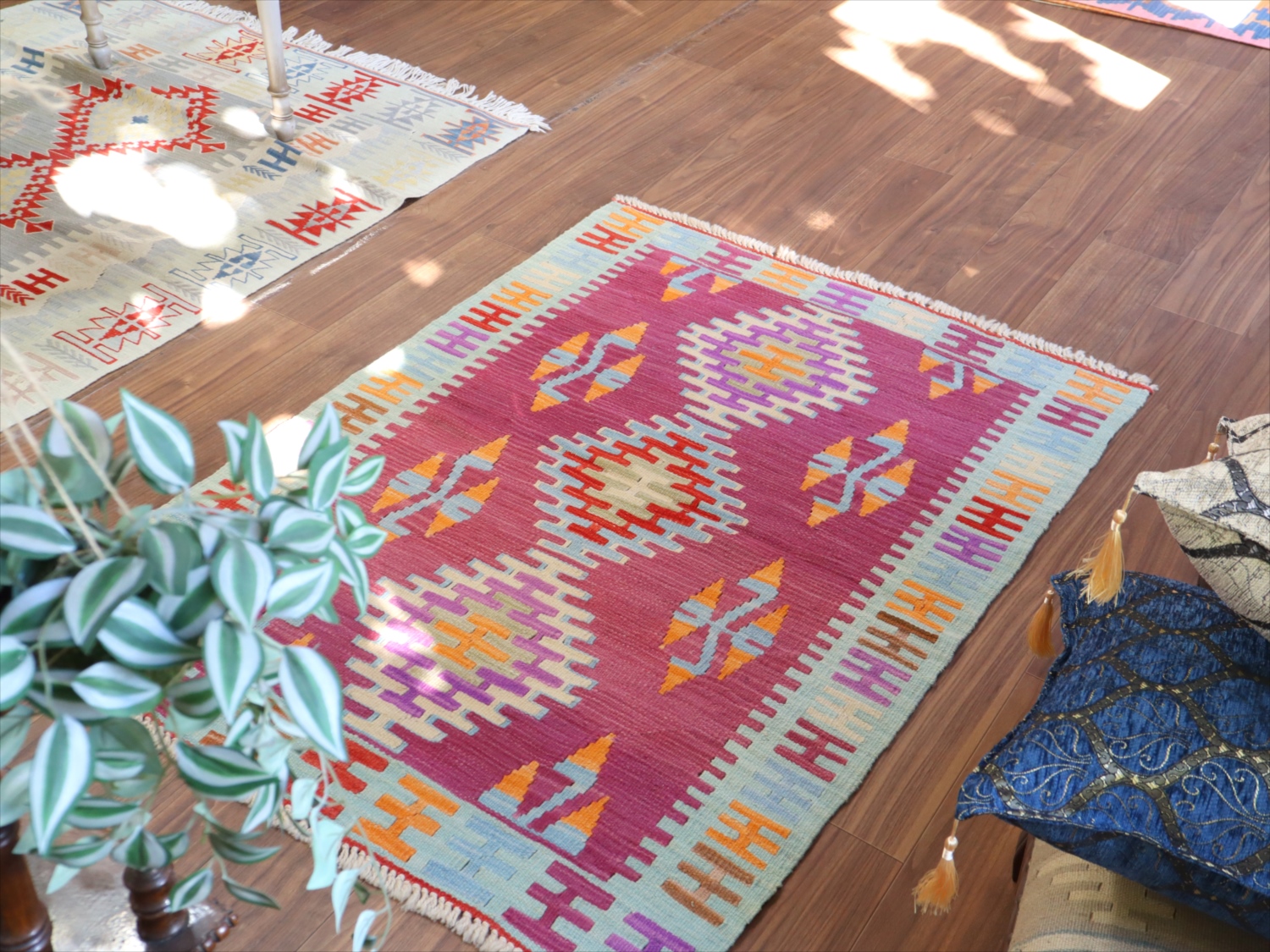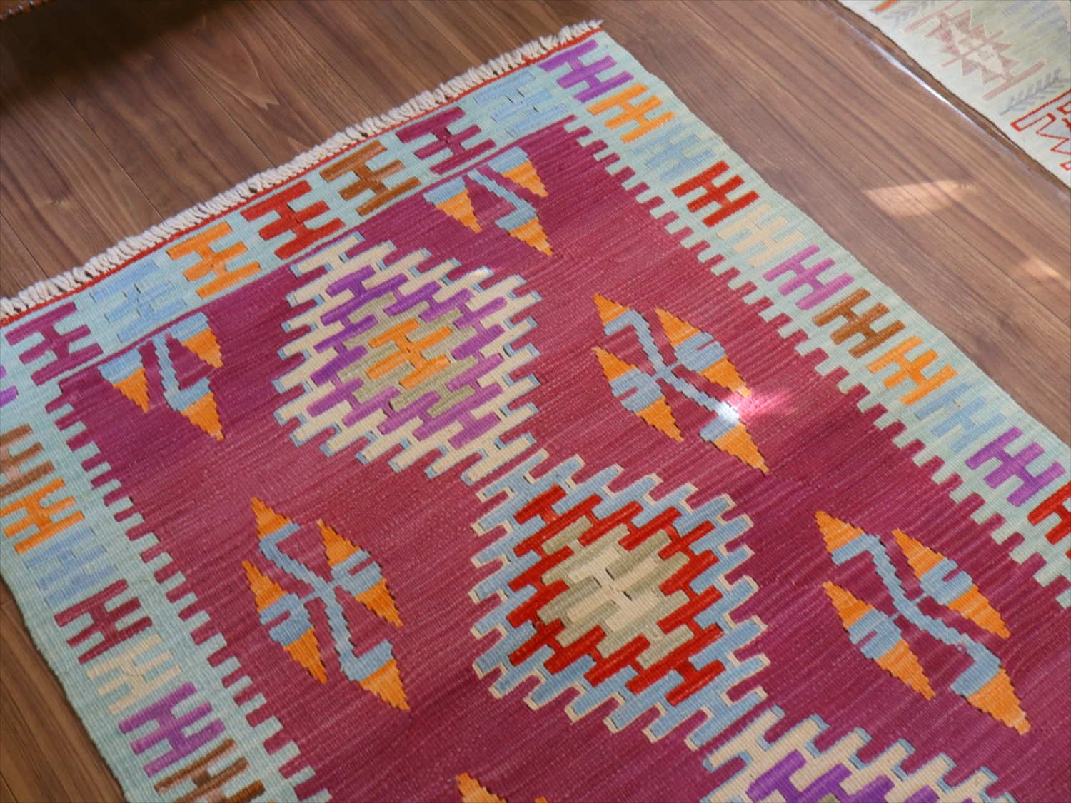 似ているデザインのキリムがあっても、細かなところは色やサイズ、形などがそれぞれ異なっていて、どれも世界で一枚だけの手織りキリムです。
