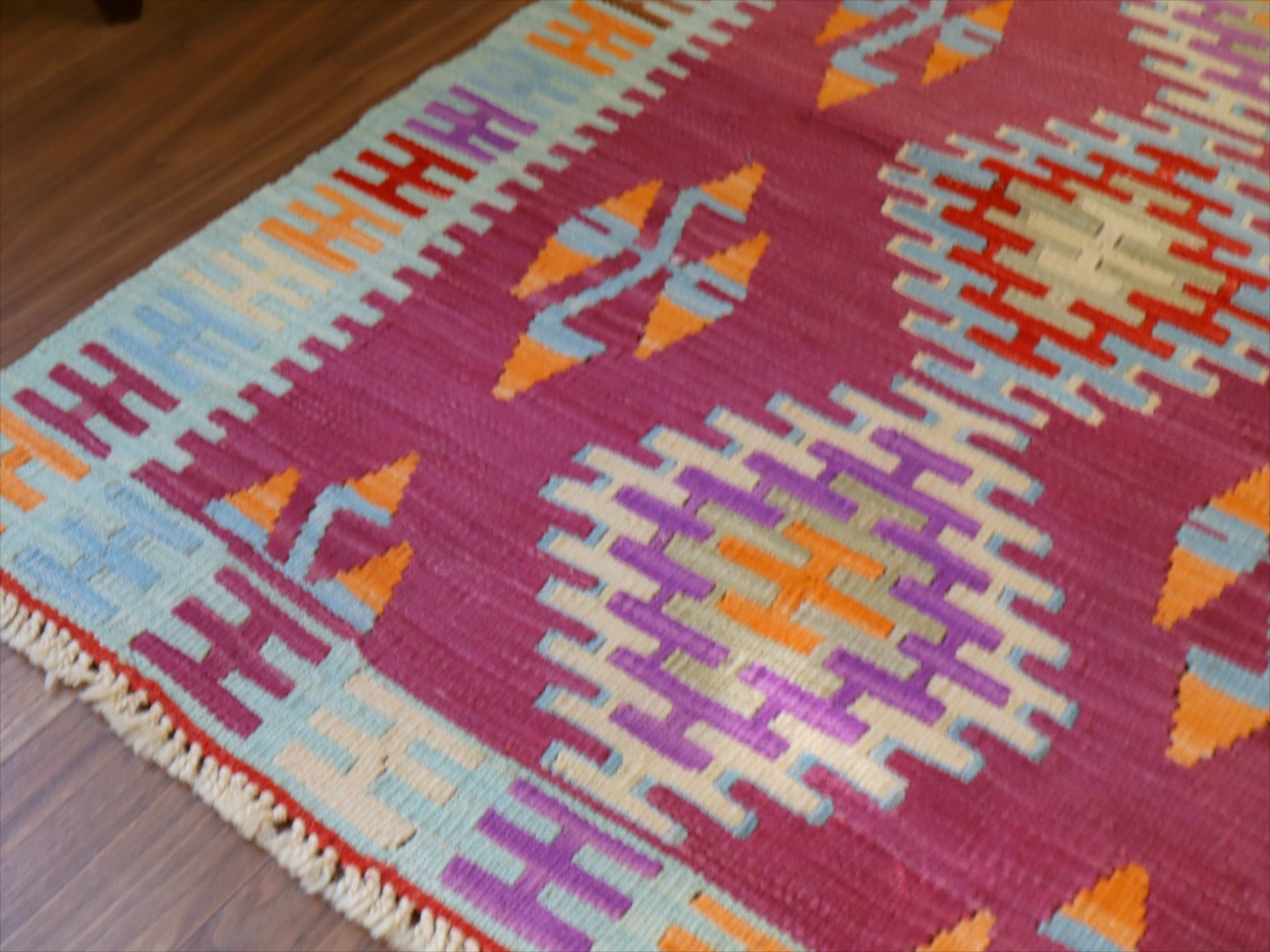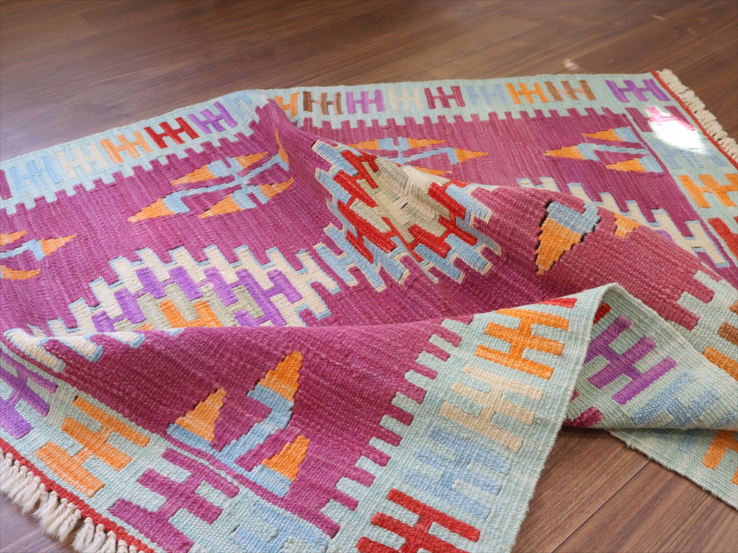 トルコキリム 手織りラグ133×100cm カイセリ産 明るい色の幾何学モチーフ