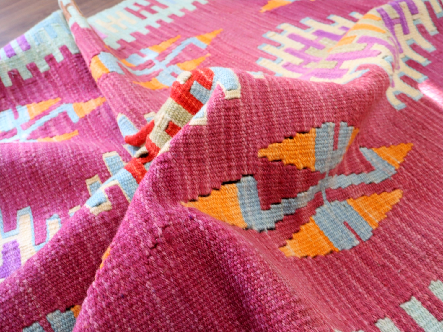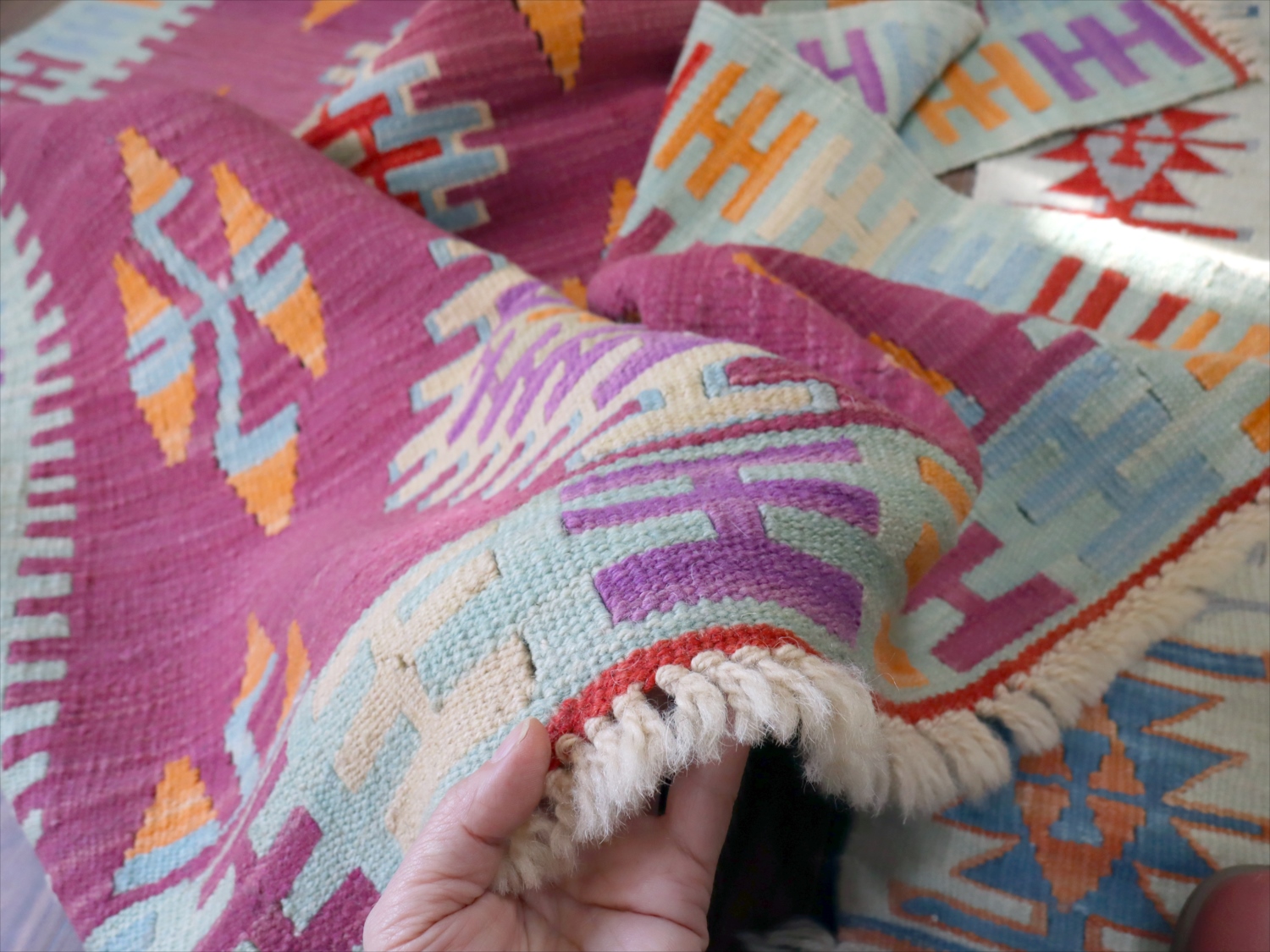 織り地がしなやかでやわらかいのがカイセリキリムの特徴です。やや厚みがあり(6mm前後)、しっかりとしたウールの重みが感じられます。モチーフの色の切り替え部分には、キリムの織りの特徴で、縦に隙間が開いています(スリットと呼んでいます)。