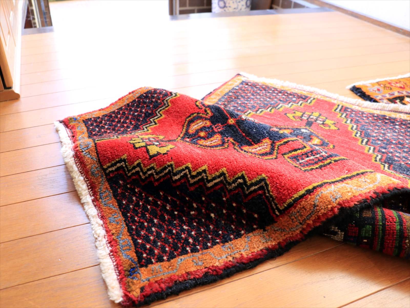 赤と黒を基調とした力強い印象のヤストゥクです。裏面をみると、グリーンやブルーなどの濃い色が残っていて、織られた当時はとてもにぎやかな色使いだったことがわかります。現状の色は、赤と黒、オレンジが褪色せずに残ったものです。
