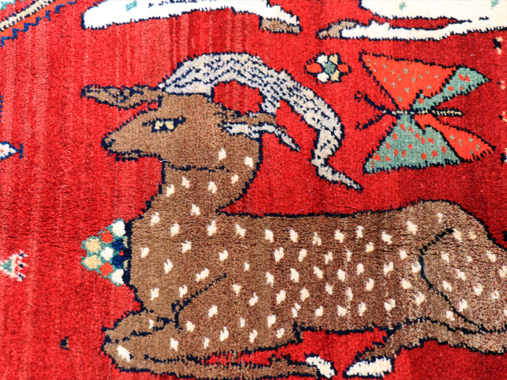 立派な角を持つ牡鹿が優雅に座ってくつろいでいる様子が織り込まれています。鹿は家畜ではありませんが、森の中から親子仲良く現れる鹿は、家庭円満の象徴とも言われ、カシュカイ族のラグにはたびたび登場するモチーフです。上下には、スカラベのようなモチーフのひし形のメダリオンが4つ並んでいて、ラグとしてはとてもユニークな配置の一枚。