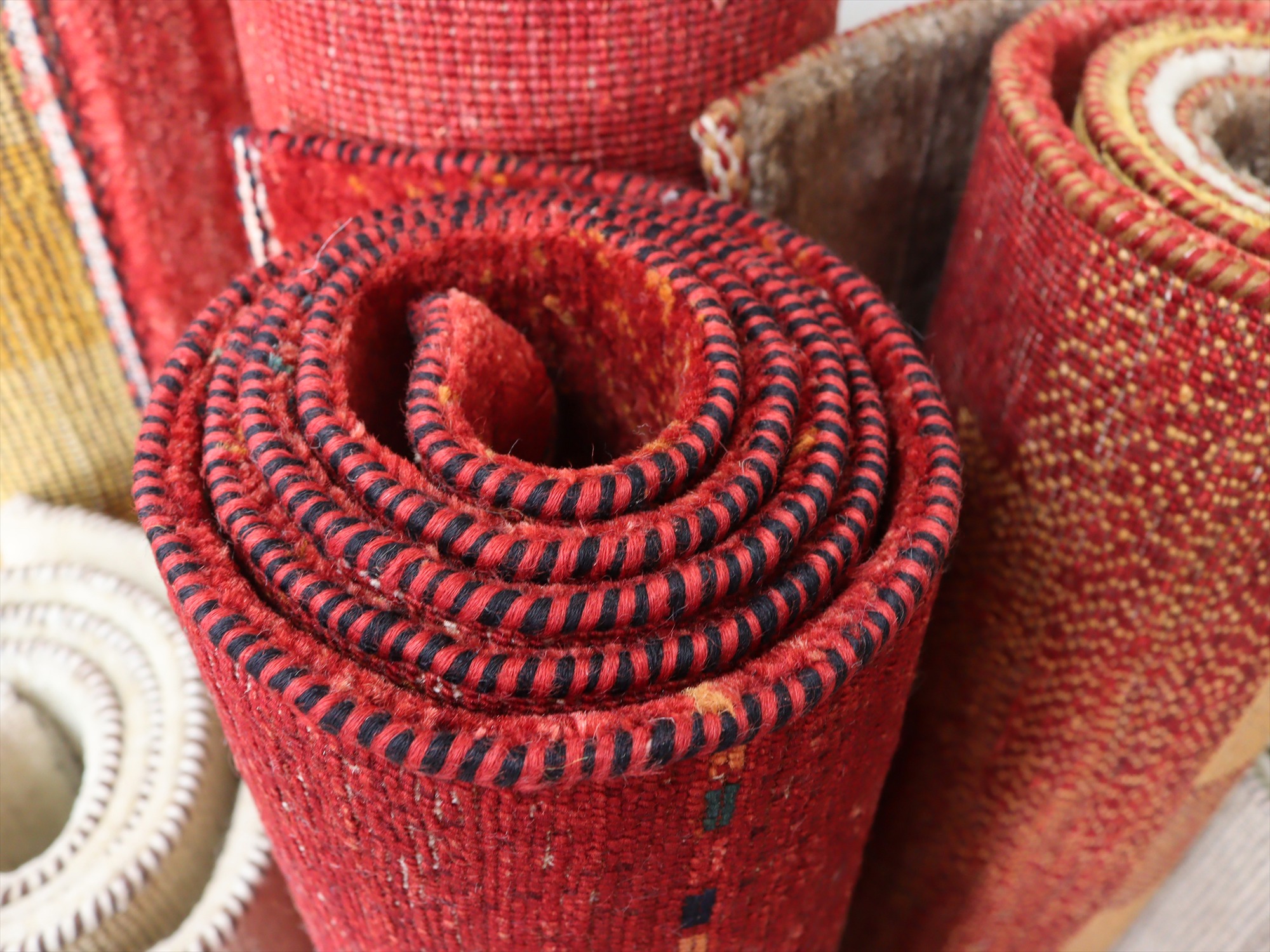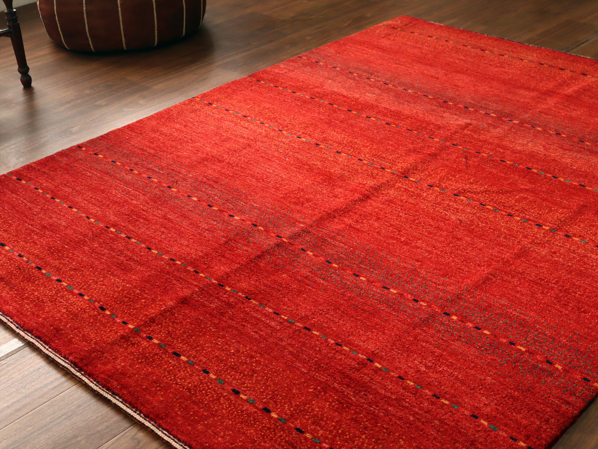 濃淡のあるレッドが繊細に表現された、シンプルなボーダーデザインのギャッベ。深みのある赤からやや明るい朱色へと移ろう、自然なグラデーションが一面に広がり、力強さと温もりを感じさせます。さりげなく織り込まれた小さな色糸により、ボーダーが成されシンプルながらもアクセントの効いた1枚に。