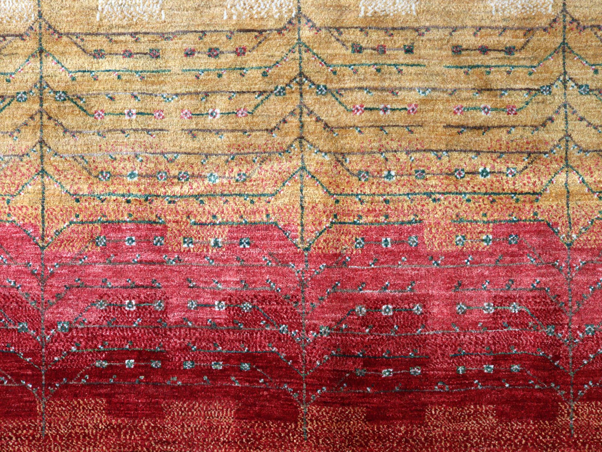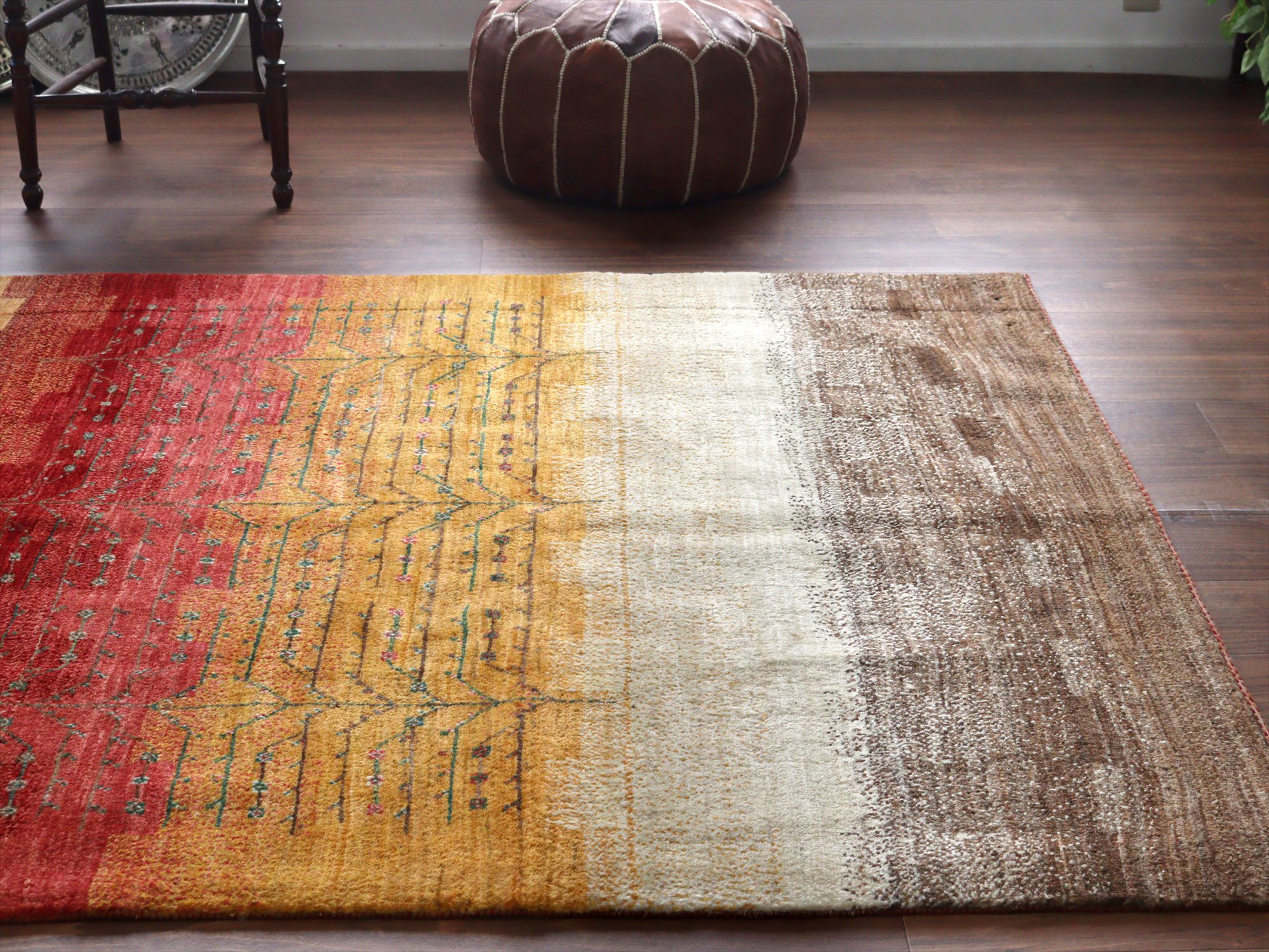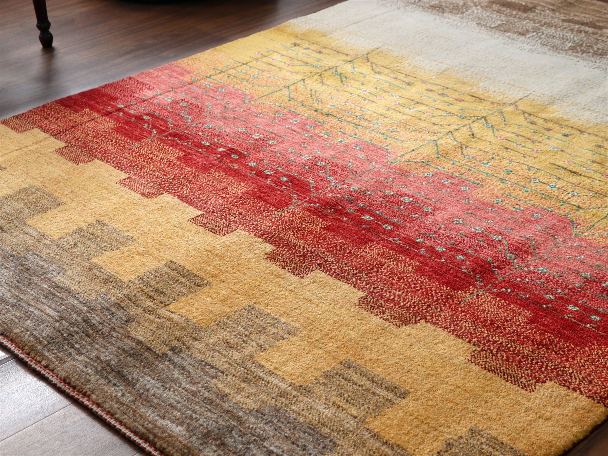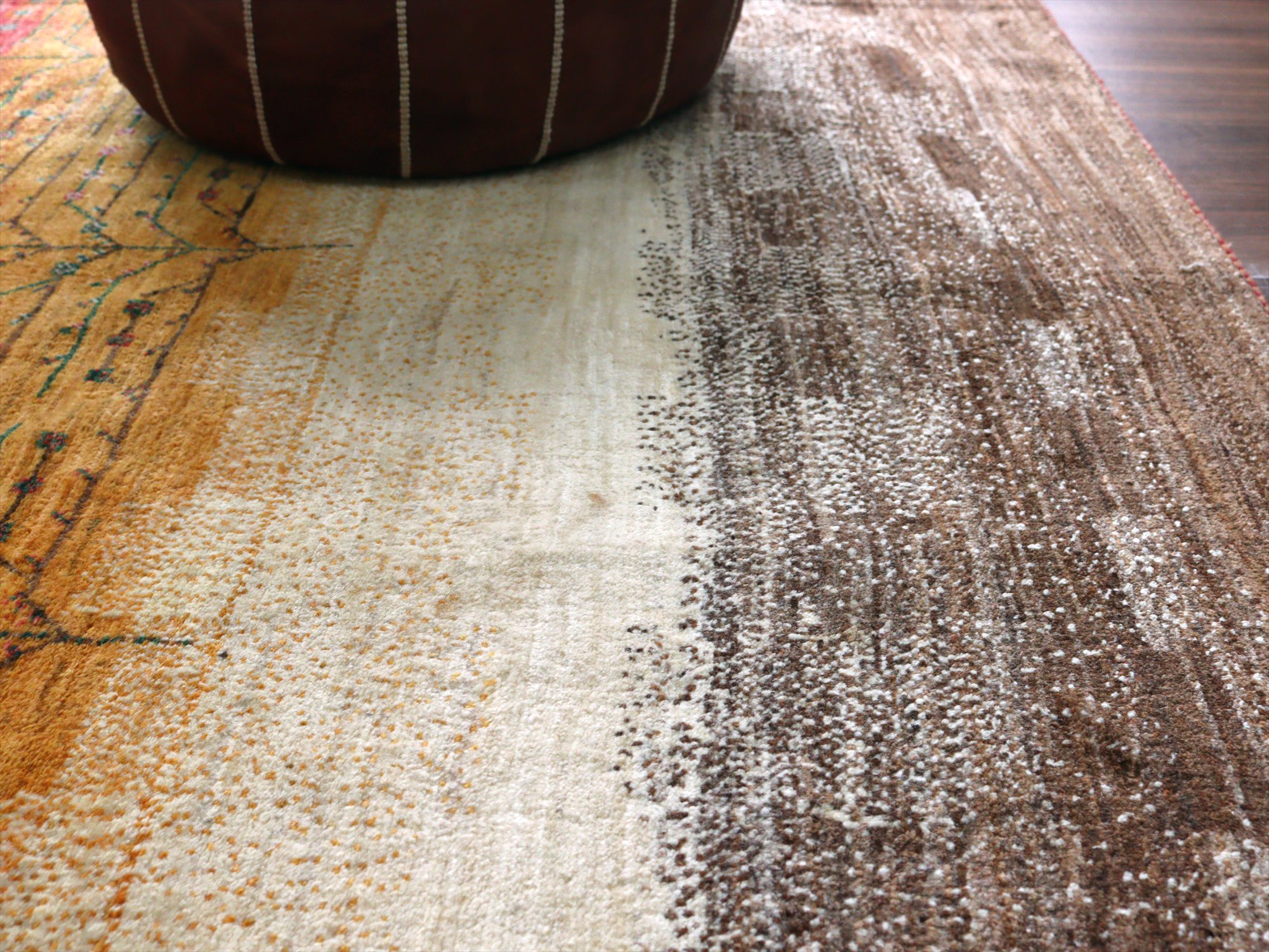 織り目の細かさを活かして、繊細で情緒的なデザインを表現。完成度が高く、バランスの整ったデザインの中に、左右非対称なモチーフやアブラッシュ(色ムラ)などの手織りラグならではの“ゆらぎ”が見え隠れするところが、とても魅力的です。