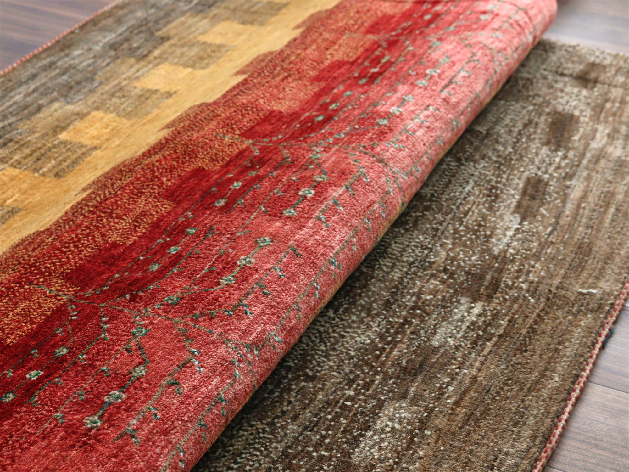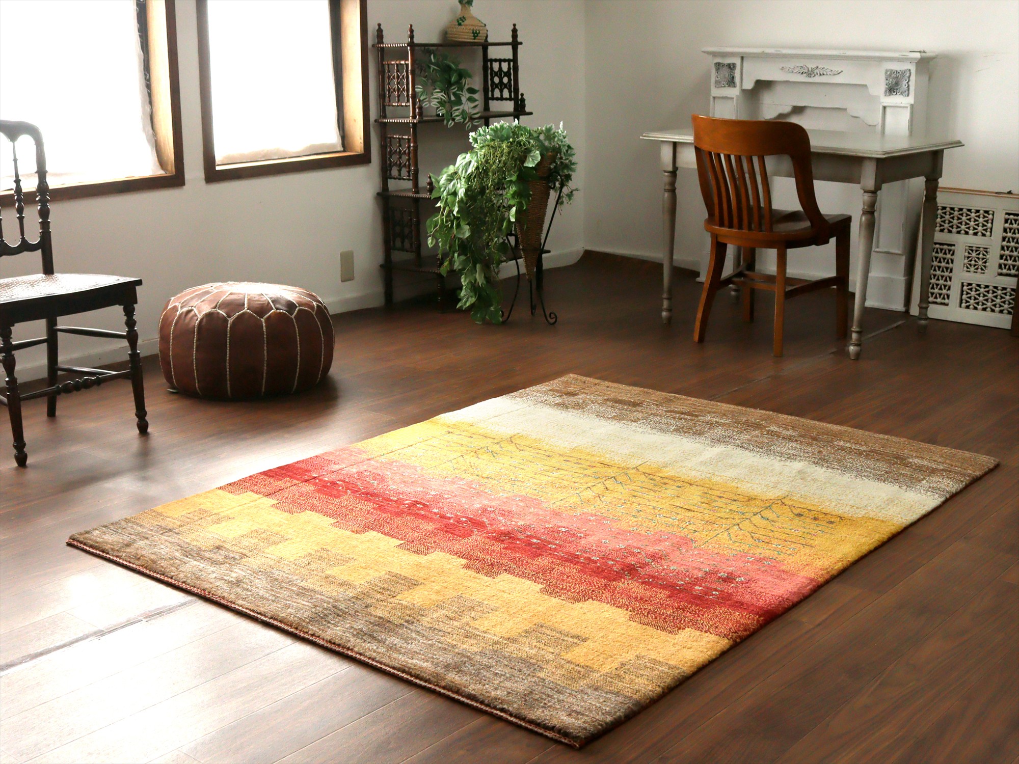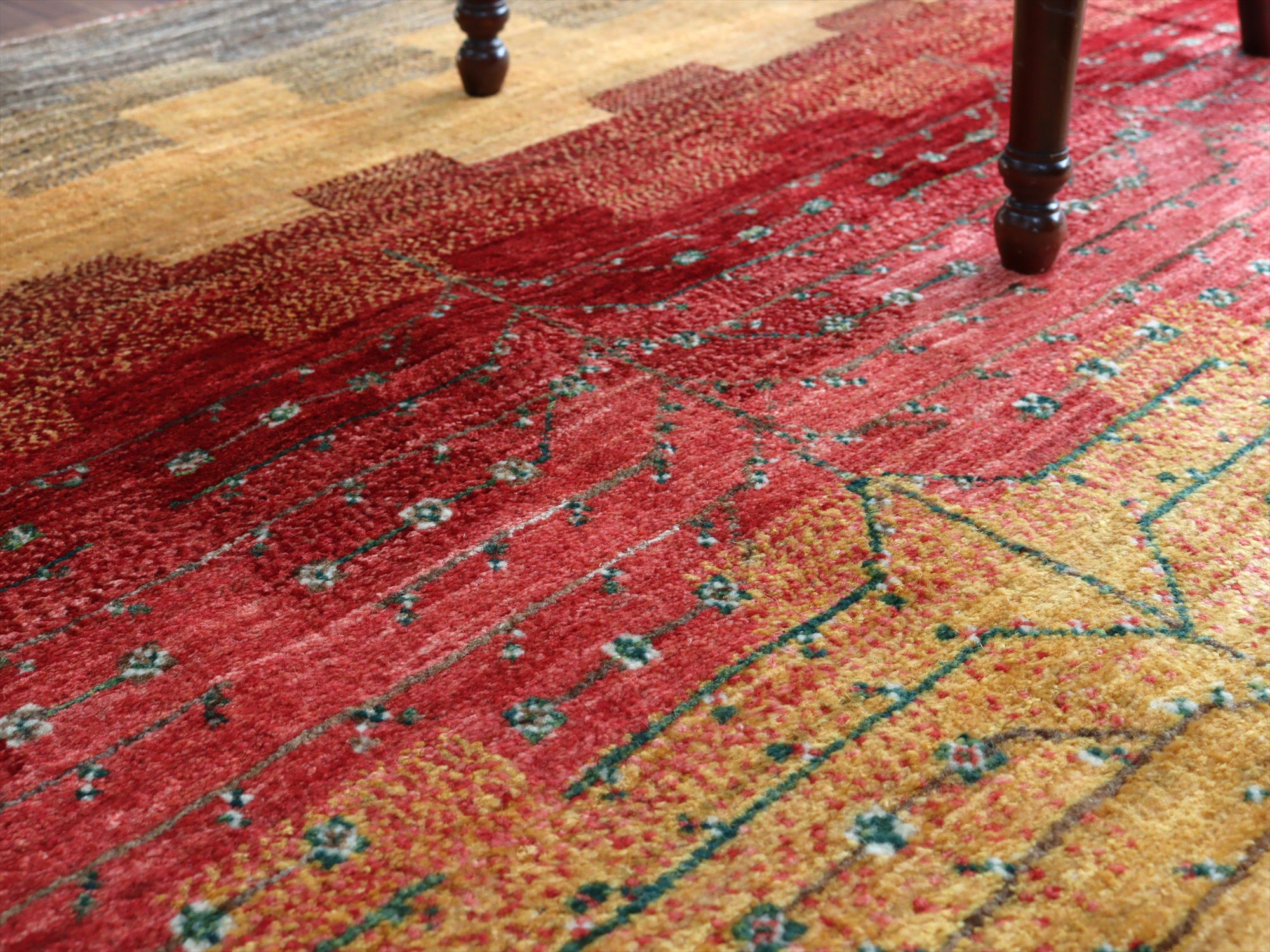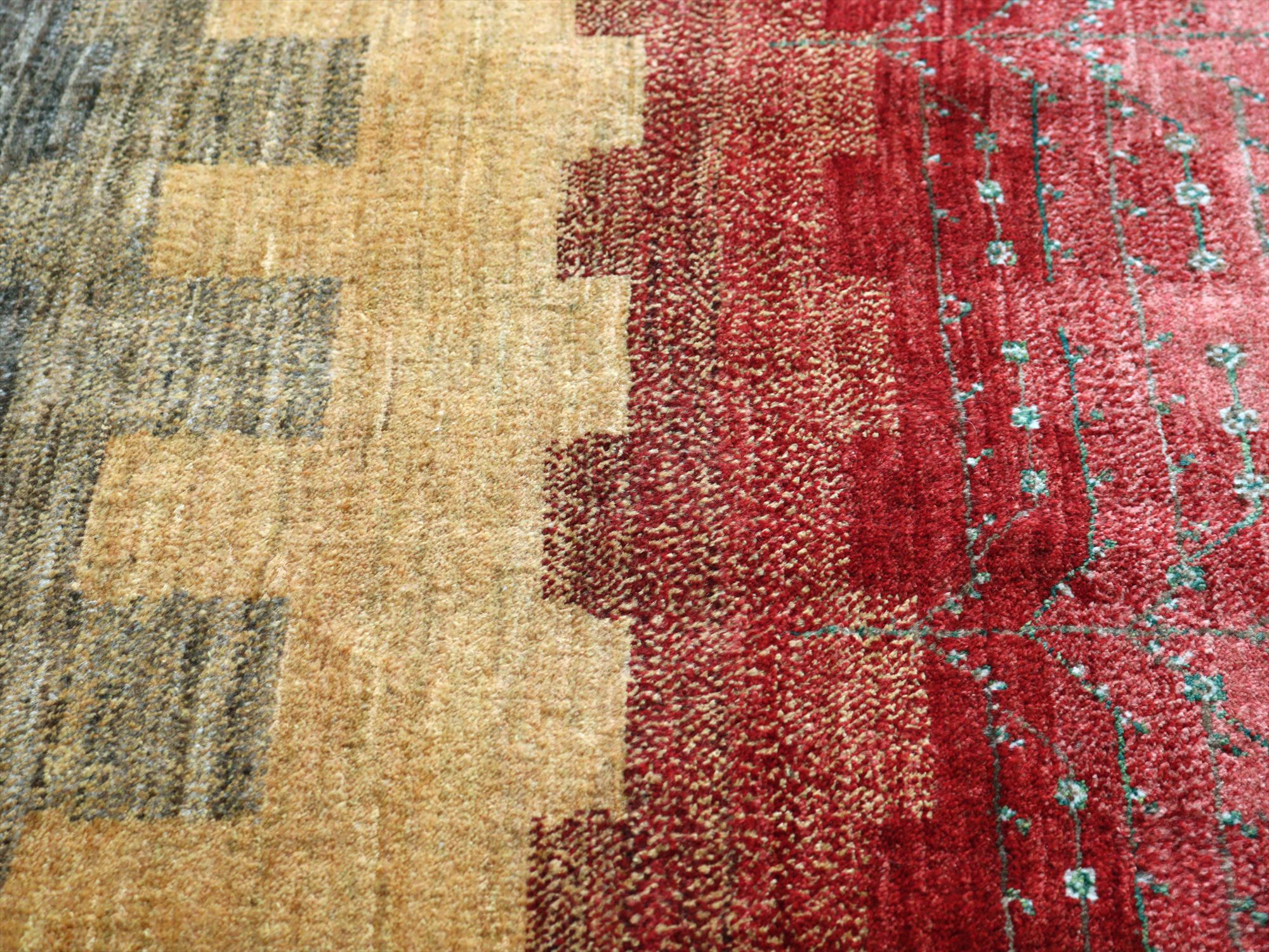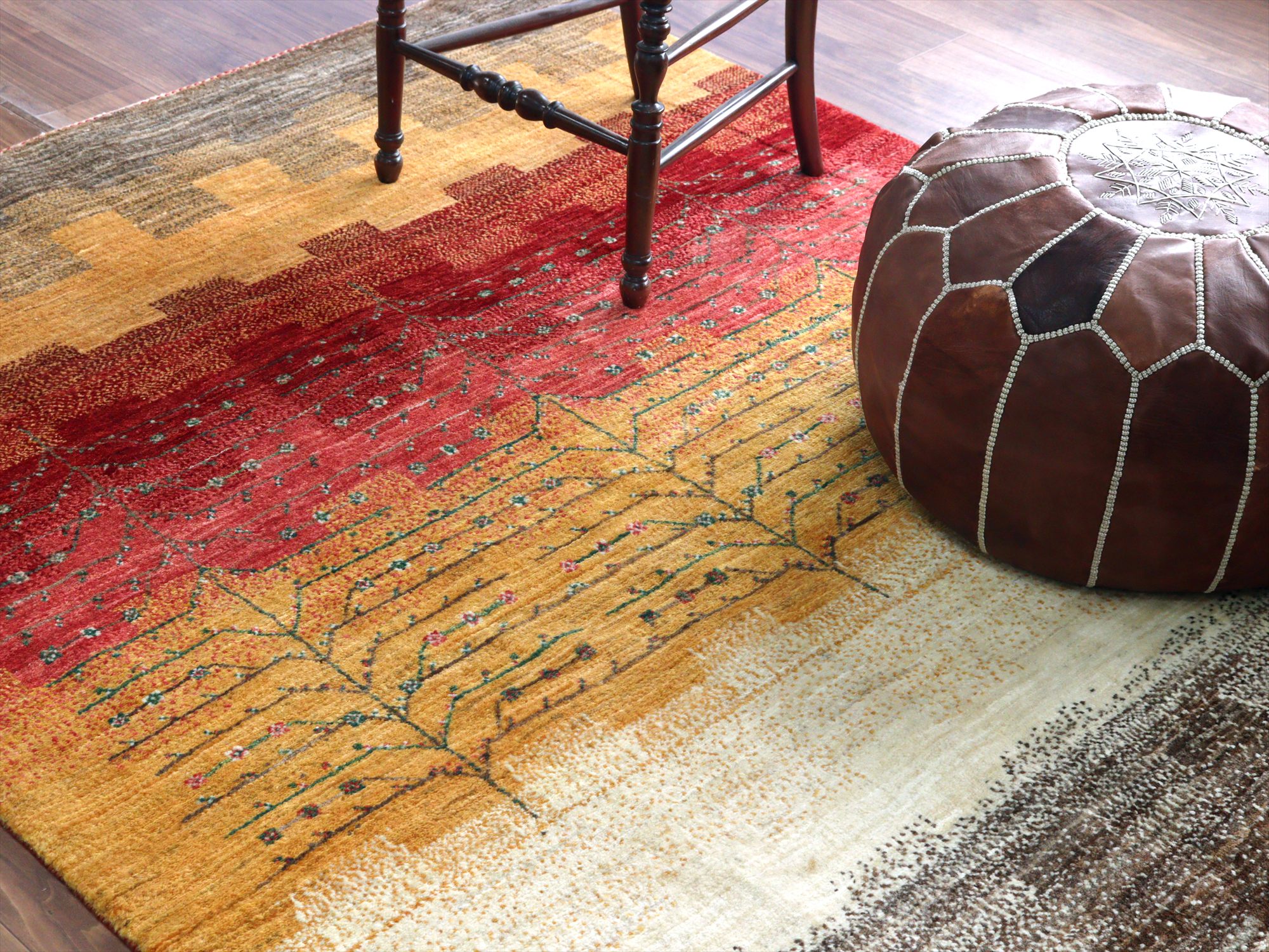 織り目の細かさを活かして、繊細で情緒的なデザインを表現。完成度が高く、バランスの整ったデザインの中に、左右非対称なモチーフやアブラッシュ(色ムラ)などの手織りラグならではの“ゆらぎ”が見え隠れするところが、とても魅力的です。