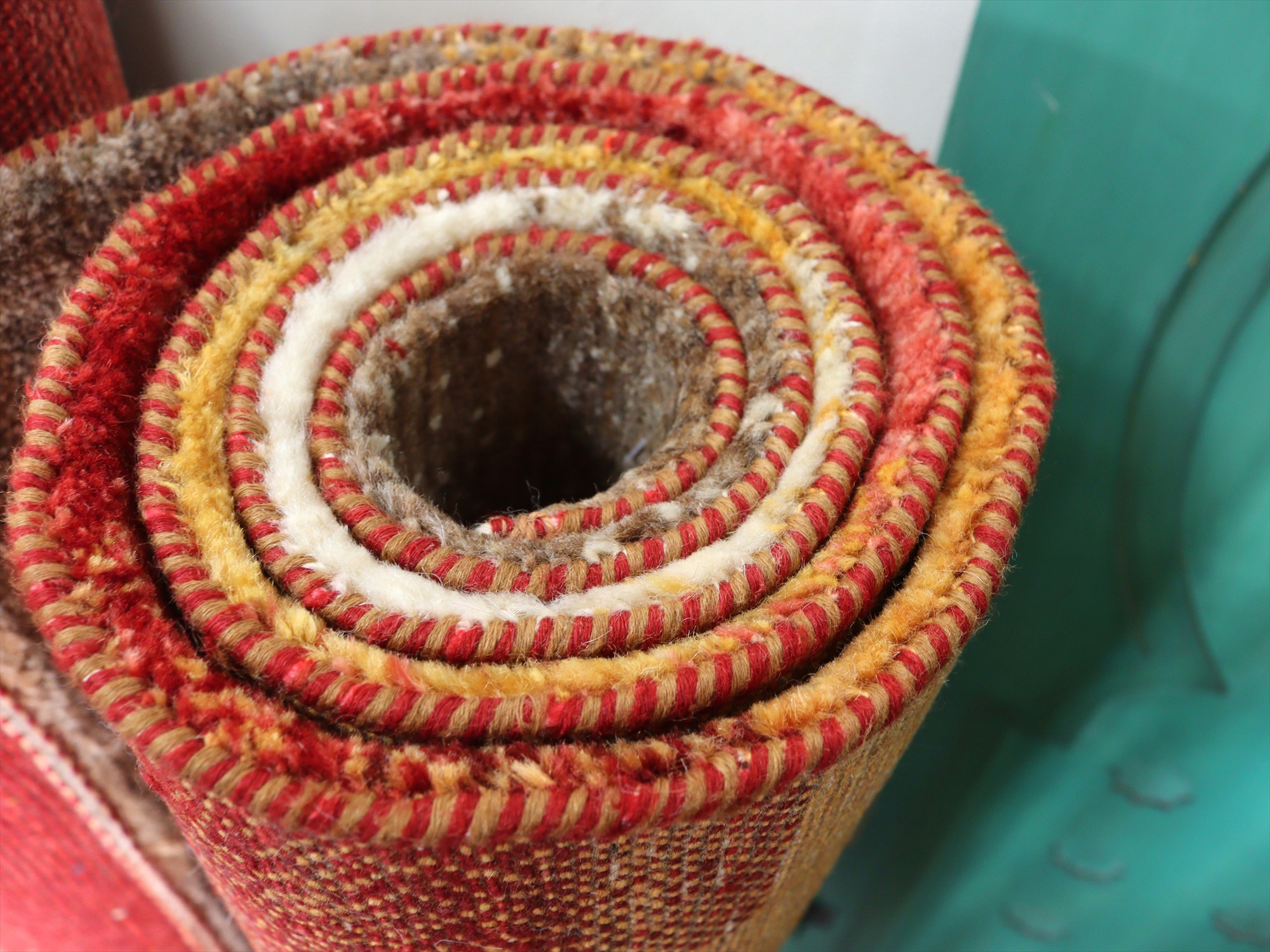 上下の縦糸を巻き込んでいます。ベースを含めたラグの厚みは、1.3cm程でパイルはすっきりとしていてモチーフがきれいに表現されています。