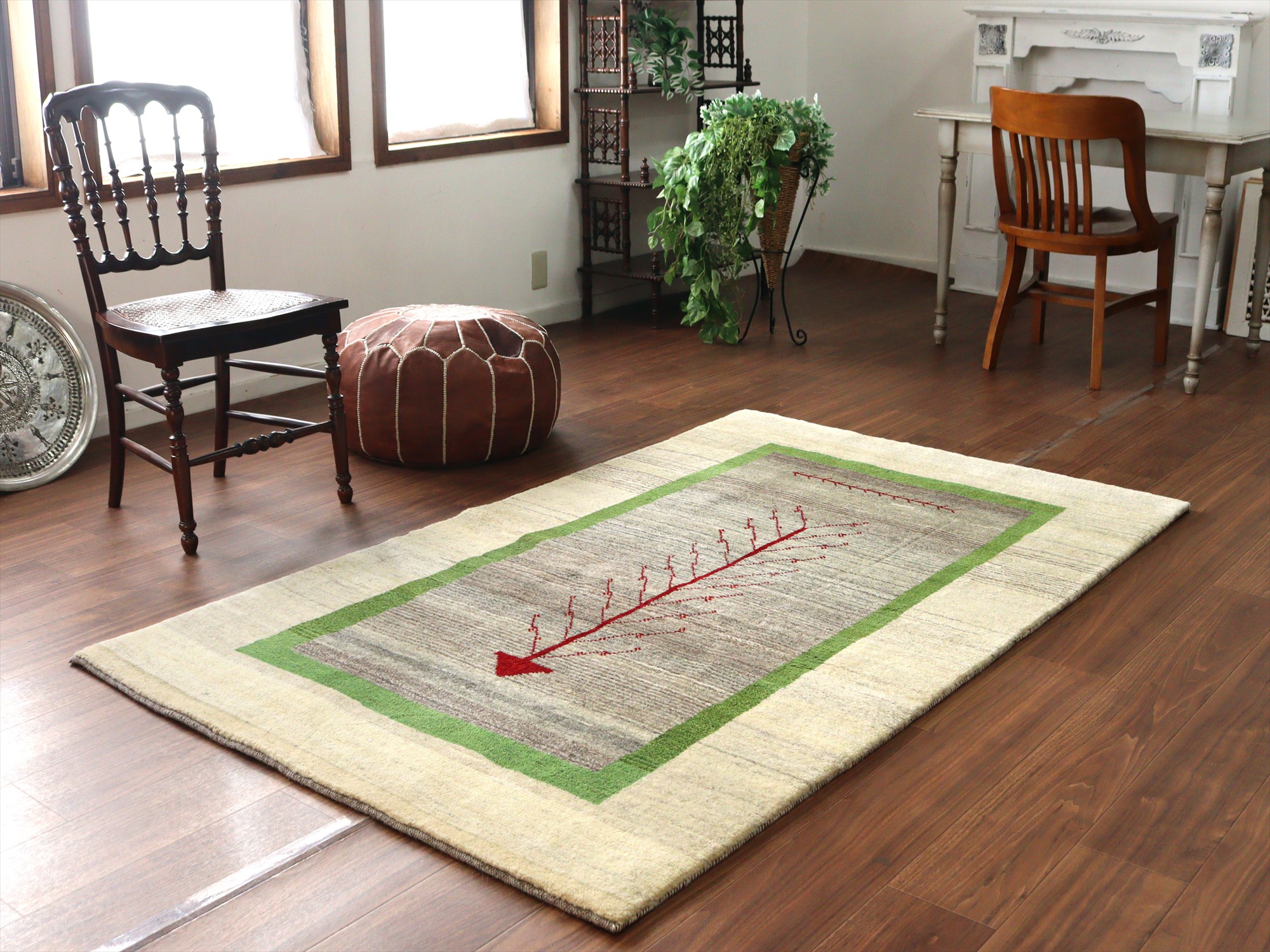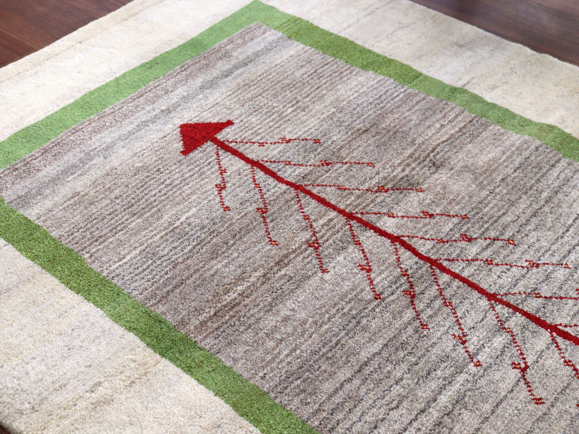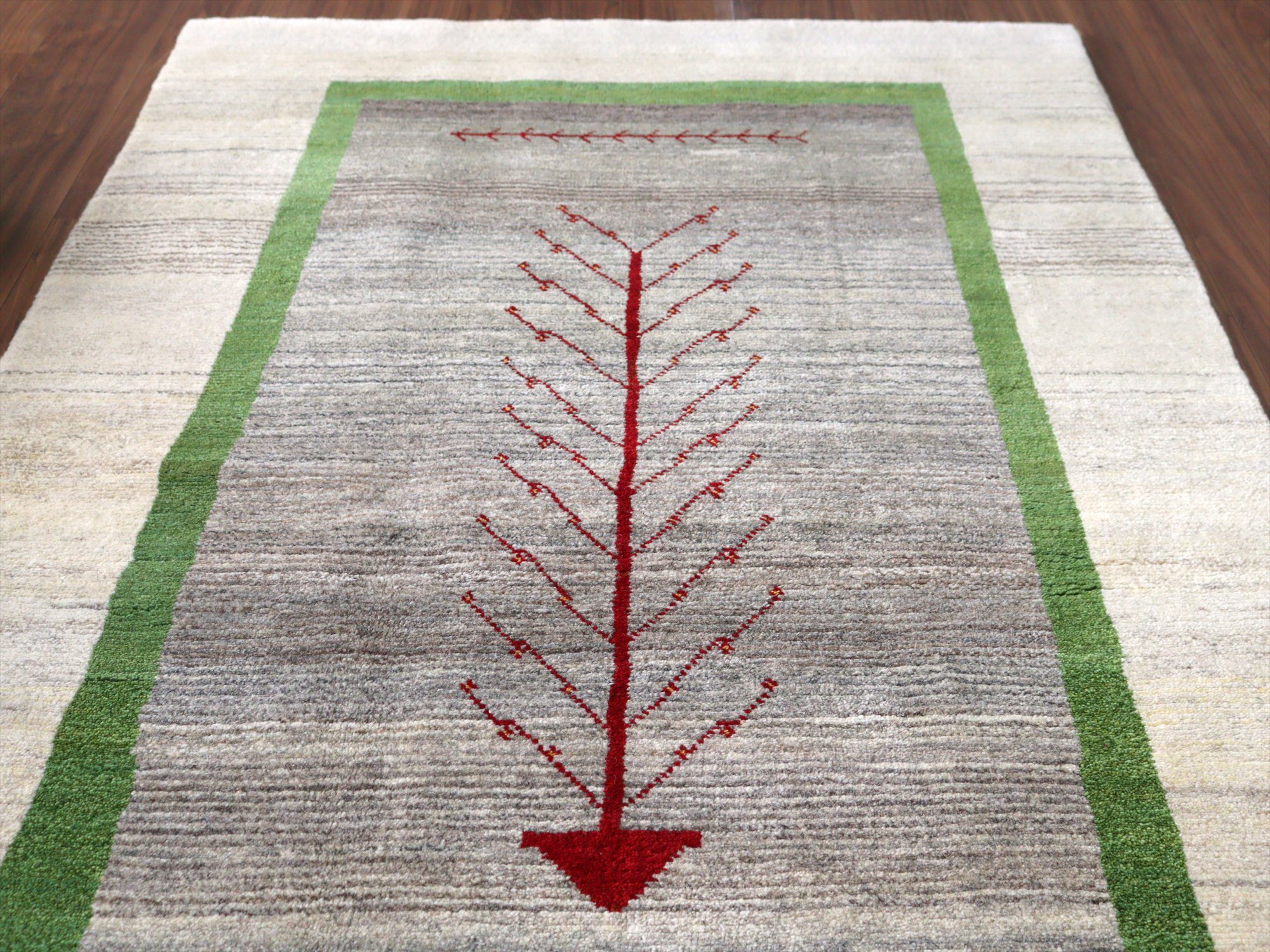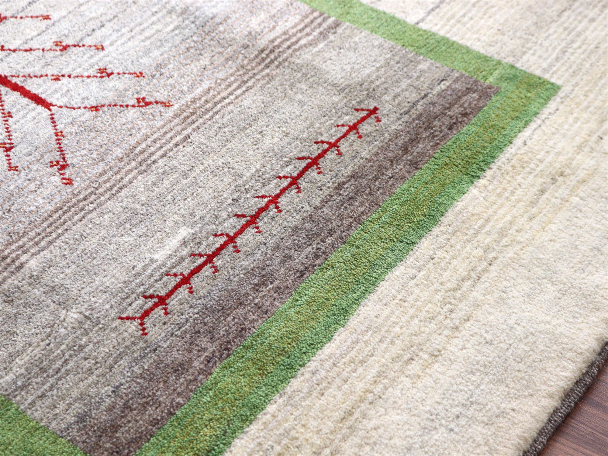 外側にアイボリー、手で描いたようなグリーンのフレームの内側には、グレーのグラデーションに赤い色糸で生命の樹が織り込まれています。手織りらしさを感じられる素朴な雰囲気のギャッベです。