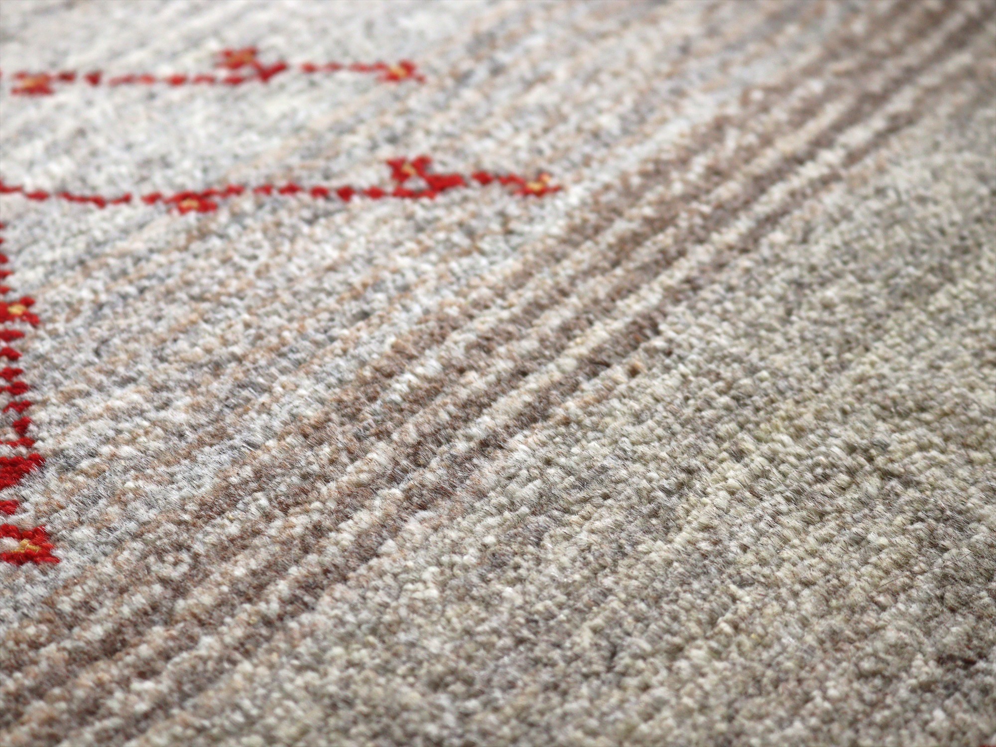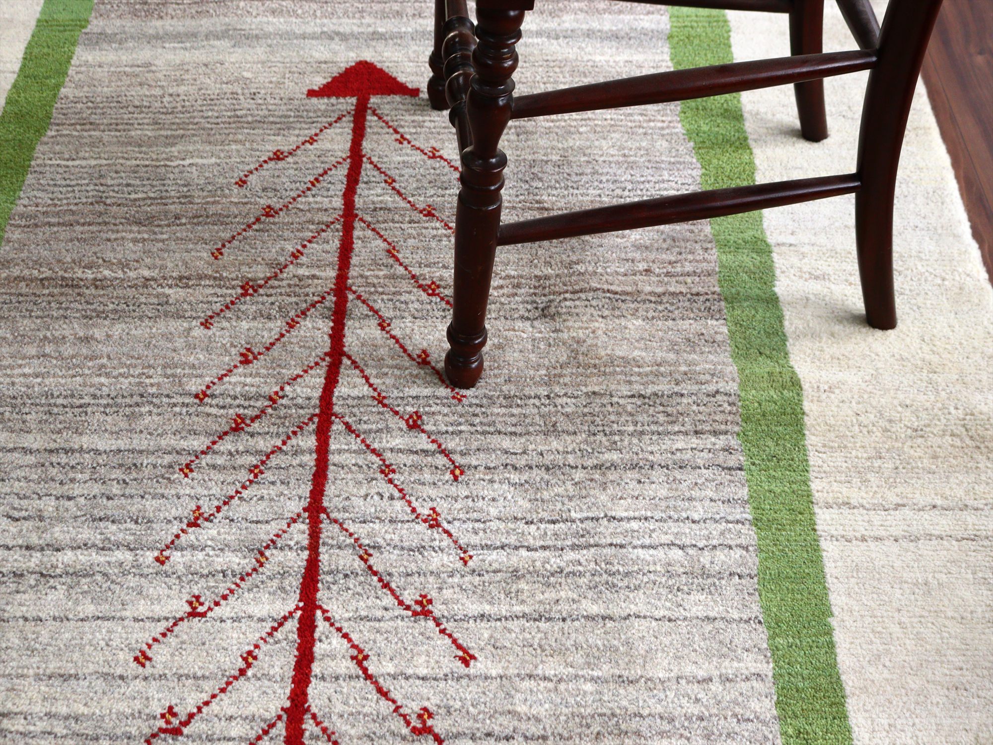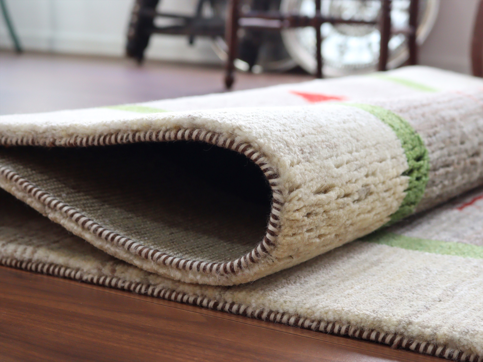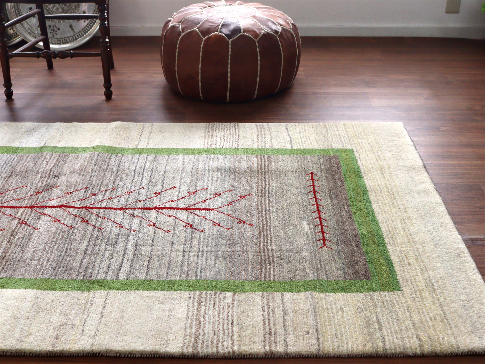 外側にアイボリー、手で描いたようなグリーンのフレームの内側には、グレーのグラデーションに赤い色糸で生命の樹が織り込まれています。手織りらしさを感じられる素朴な雰囲気のギャッベです。