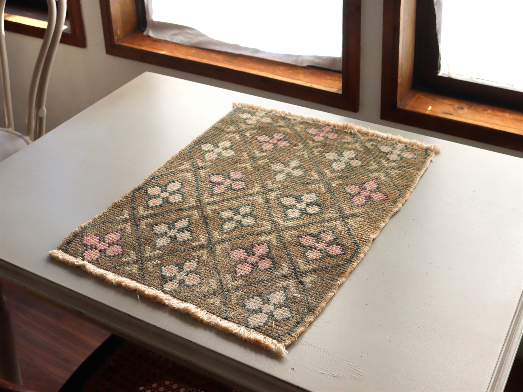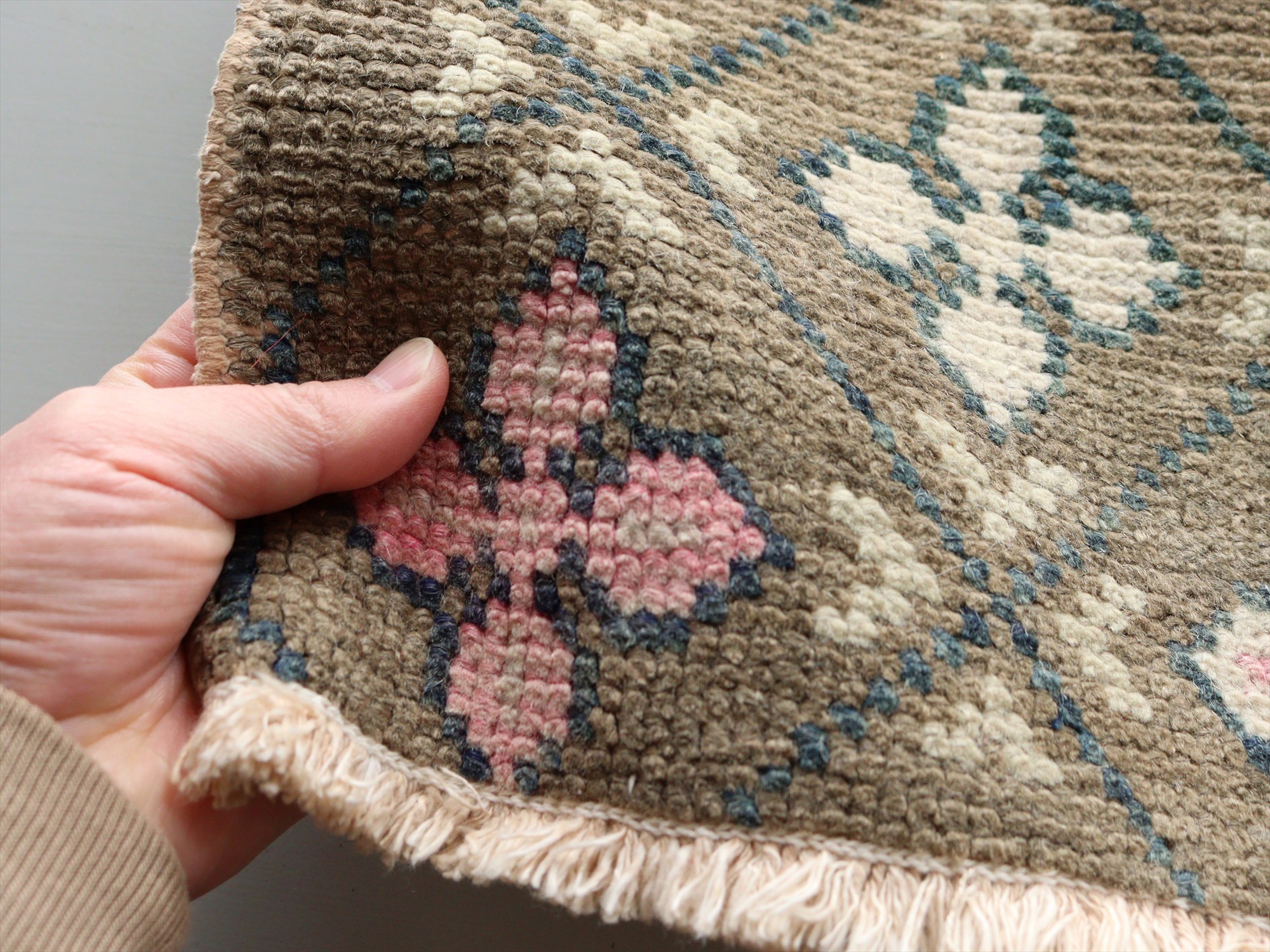 もともと大きいサイズだった絨毯からカットされたものと思われます。ブラウンベースに格子のデザイン、そこに花のような幾何学文様が連続しています。