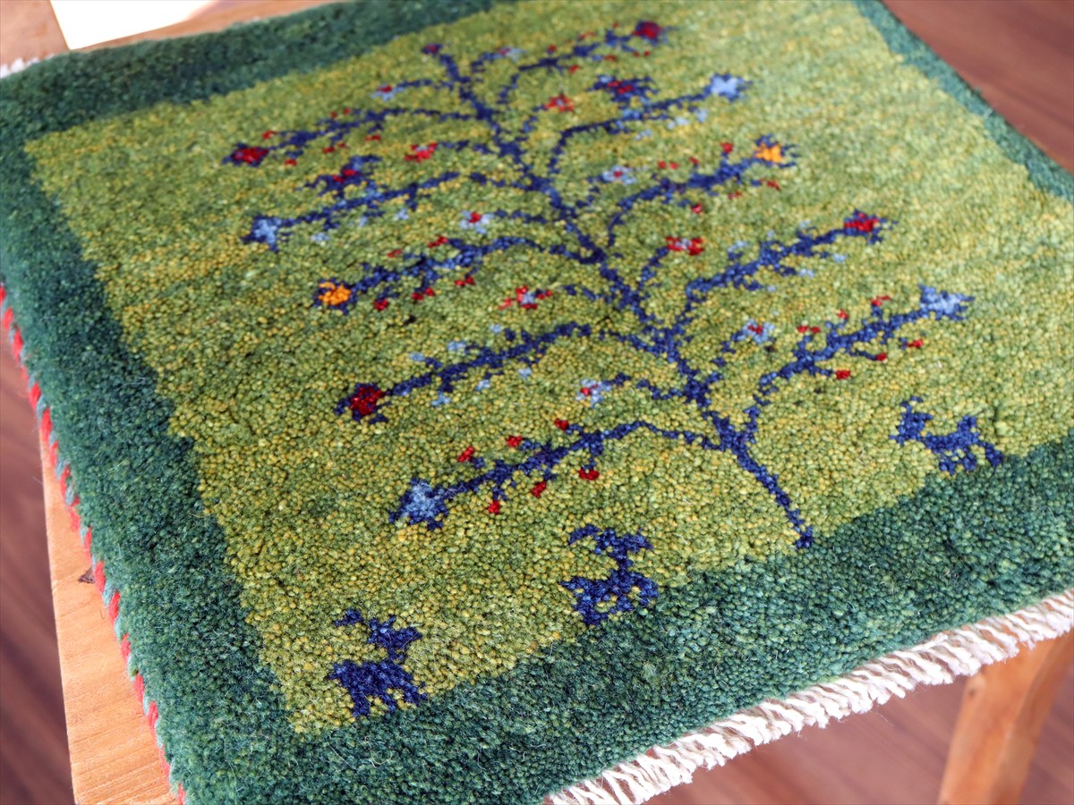 ギャッベ イラン産手織り 座布団サイズ 38×38cm グリーン 動物と生命の樹