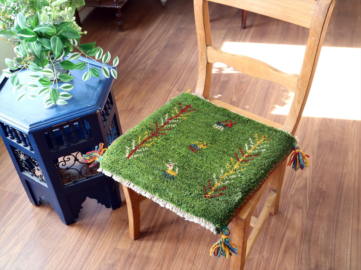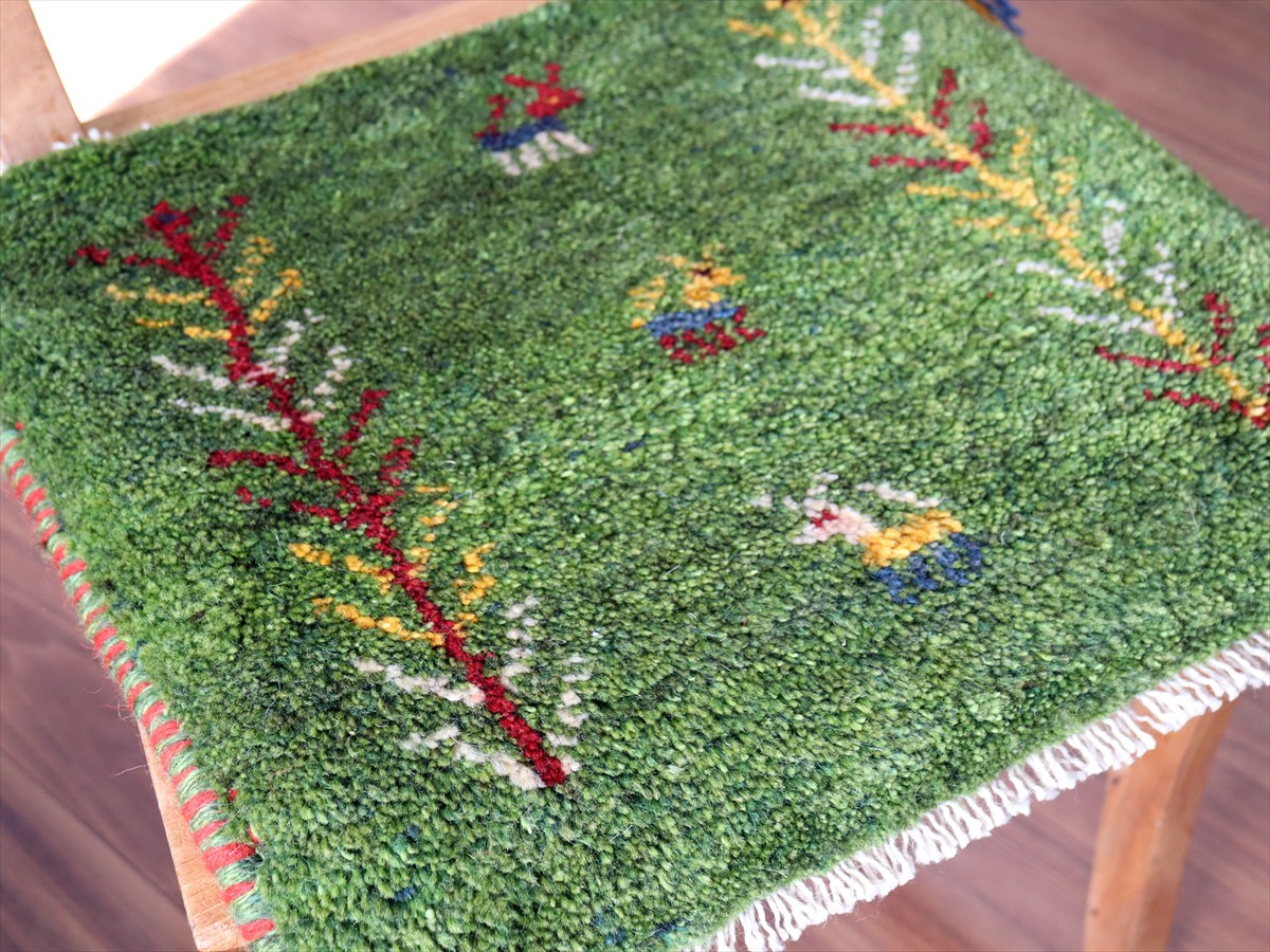 Key:イラン直輸入, GABBEH, ギャッベ, ギャベ, グリーン, 緑, 手織り, 手紡ぎ, ウール, 天然素材, ポンポン, 座布団, バザールギャッベ, ハンドメイド, 一点もの, 現品販売,ガラタバザール, 東京中野区