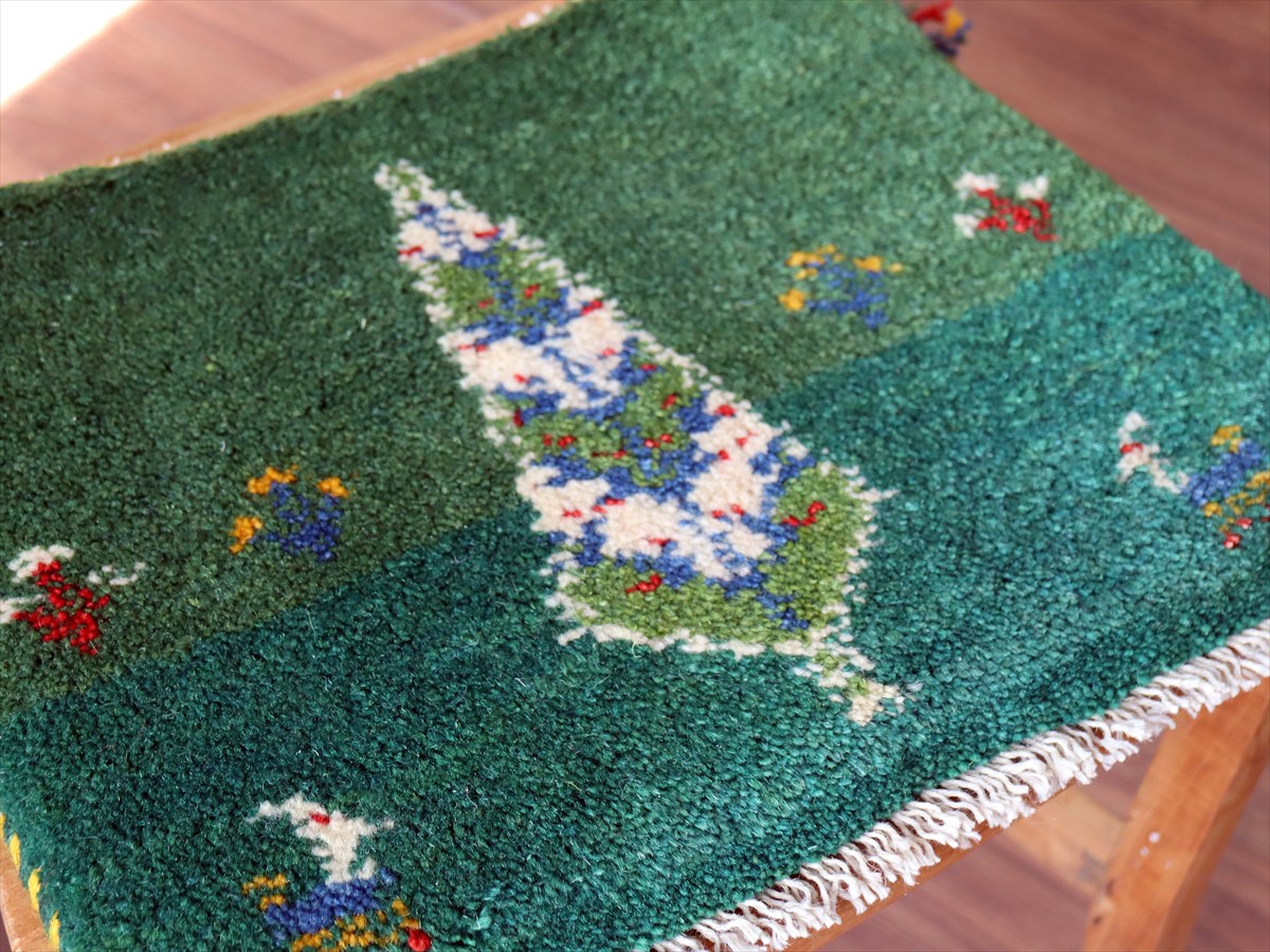 - ギャッベ イラン産手織り 座布団サイズ 34×41cm グリーン 動物と糸杉