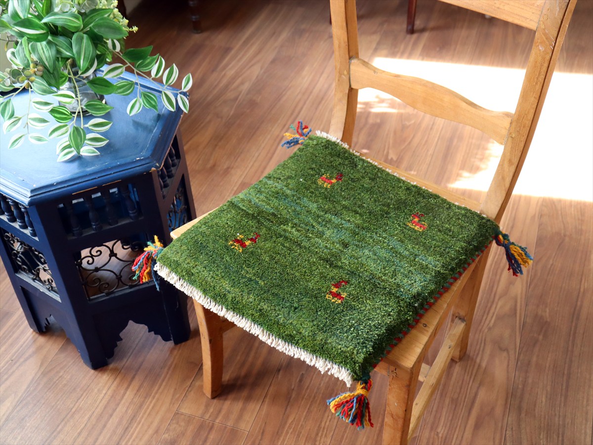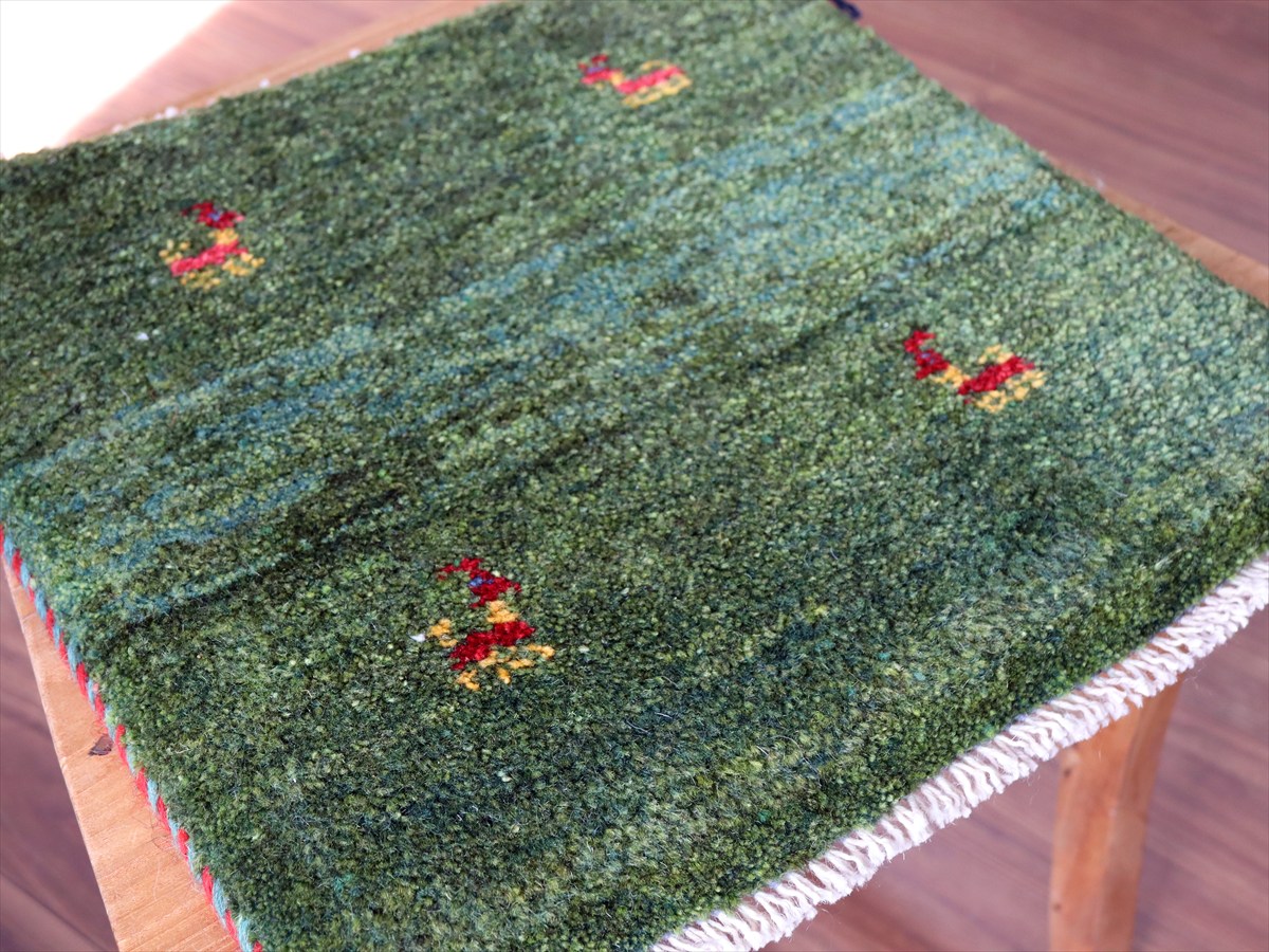 - ギャッベ イラン産手織り 座布団サイズ 39×38cm グリーン 動物モチーフ