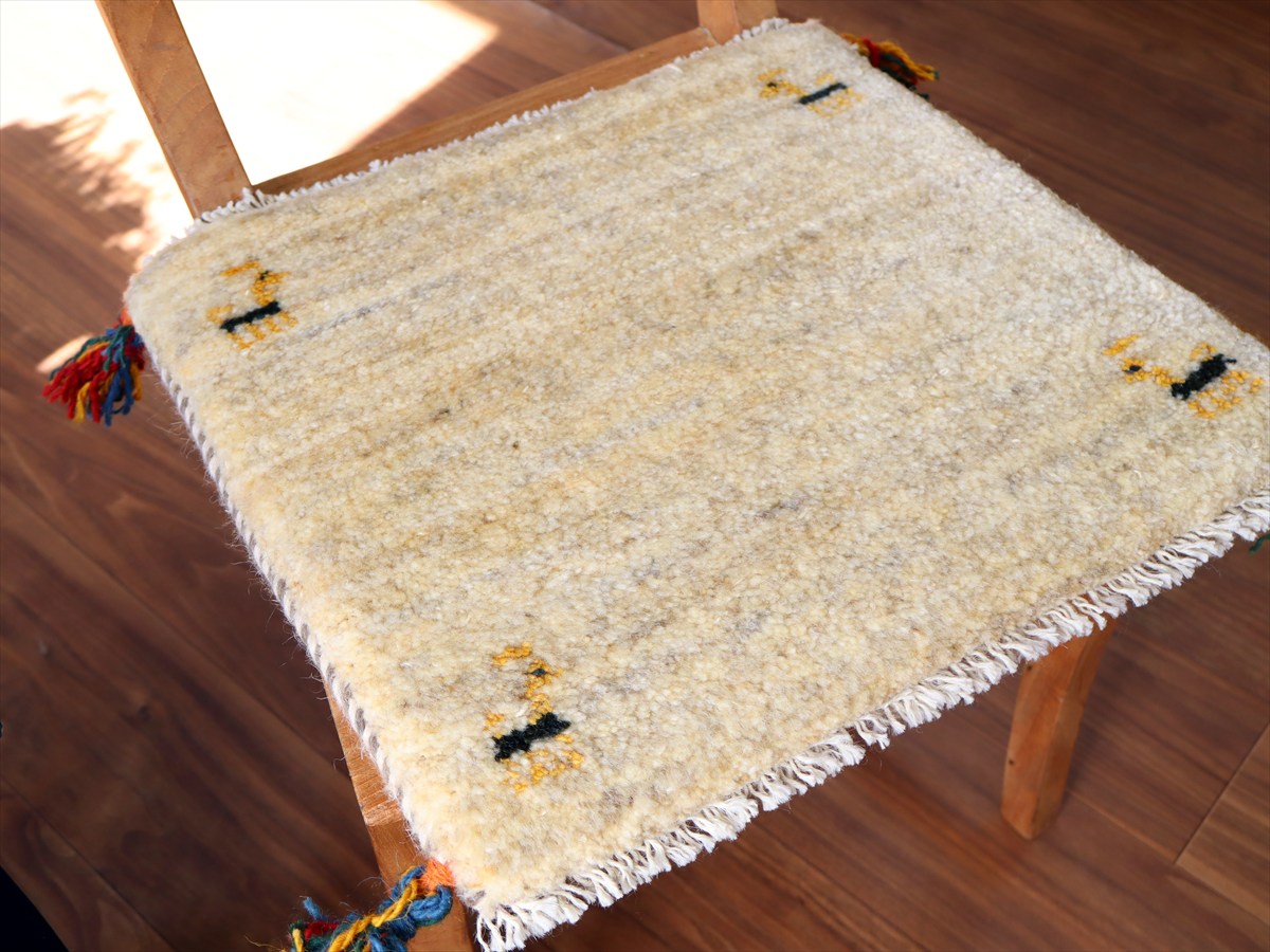 ギャッベ イラン産手織り 座布団サイズ 38×41cm ナチュラルアイボリー 動物モチーフ