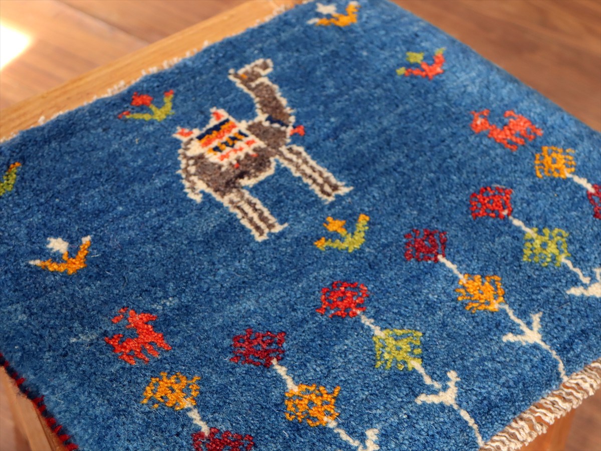 ギャッベ イラン産手織り 座布団サイズ 38×44cm ブルー ラクダと動物とフラワーデザイン