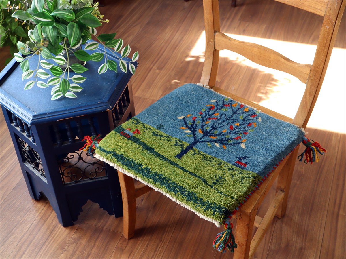 - ギャッベ イラン産手織り 座布団サイズ 38×41cm ブルー&グリーン 動物と生命の樹 風景画