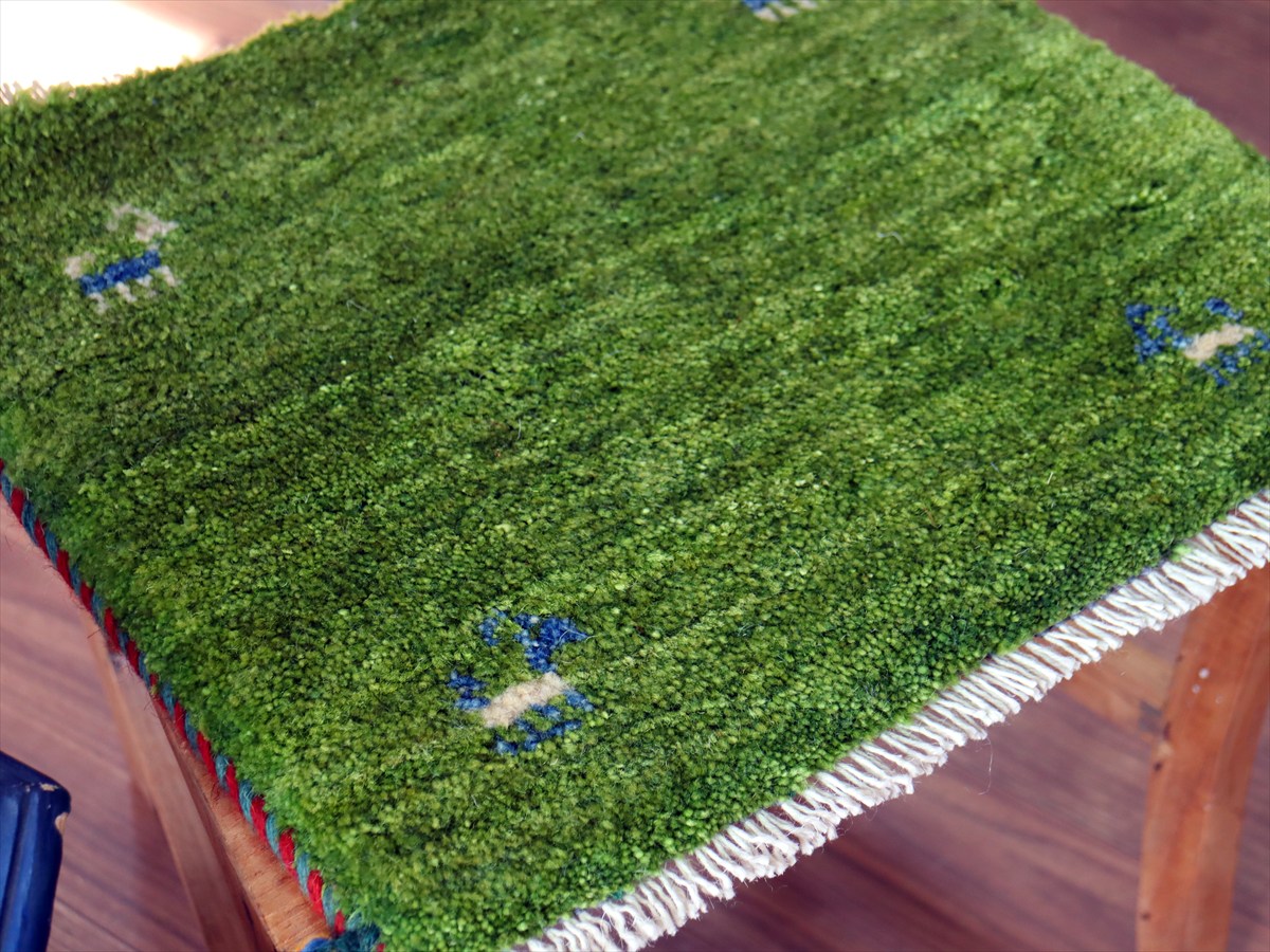 ギャッベ イラン産手織り 座布団サイズ 38×42cm グリーン 動物モチーフ