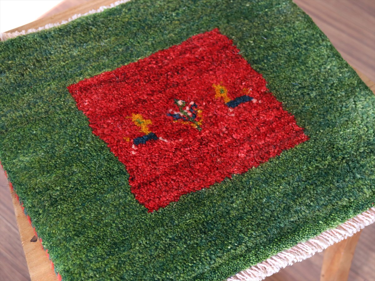 - ギャッベ イラン産手織り 座布団サイズ 38×39cm グリーン&レッド 動物と生命の樹
