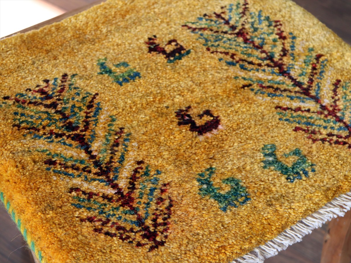 ギャッベ イラン産手織り 座布団サイズ 39×43cm イエローオレンジ 動物と連なる生命の樹