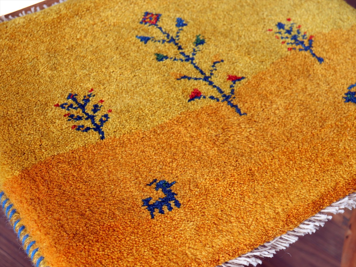 - ギャッベ イラン産手織り 座布団サイズ 39×45cm イエローオレンジ 動物と生命の樹 風景画