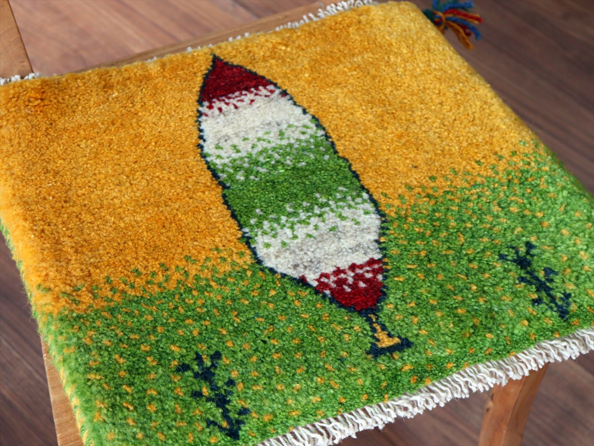 ギャッベ イラン産手織り 座布団サイズ 39×42cm イエロー&グリーン 糸杉と生命の樹