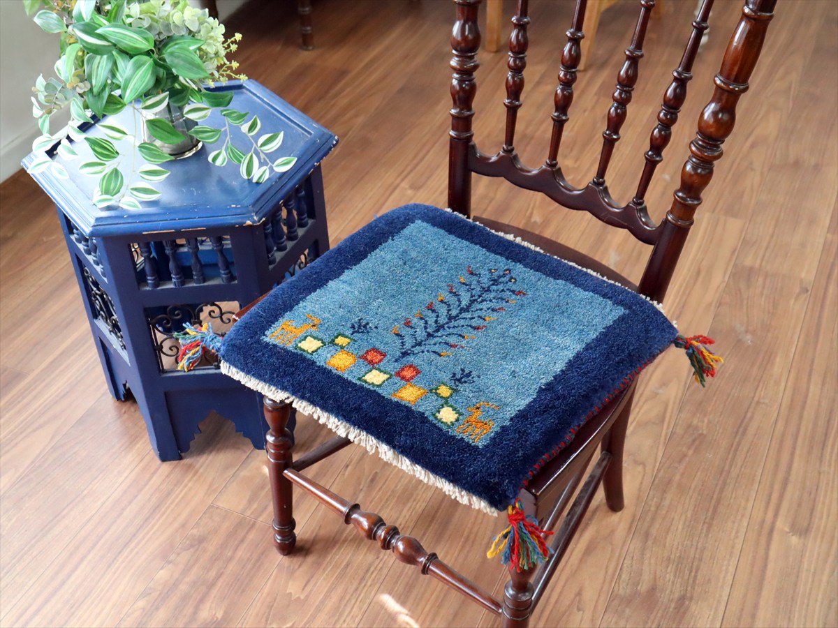- ギャッベ イラン産手織り 座布団サイズ 38×42cm ブルー 動物と生命の樹