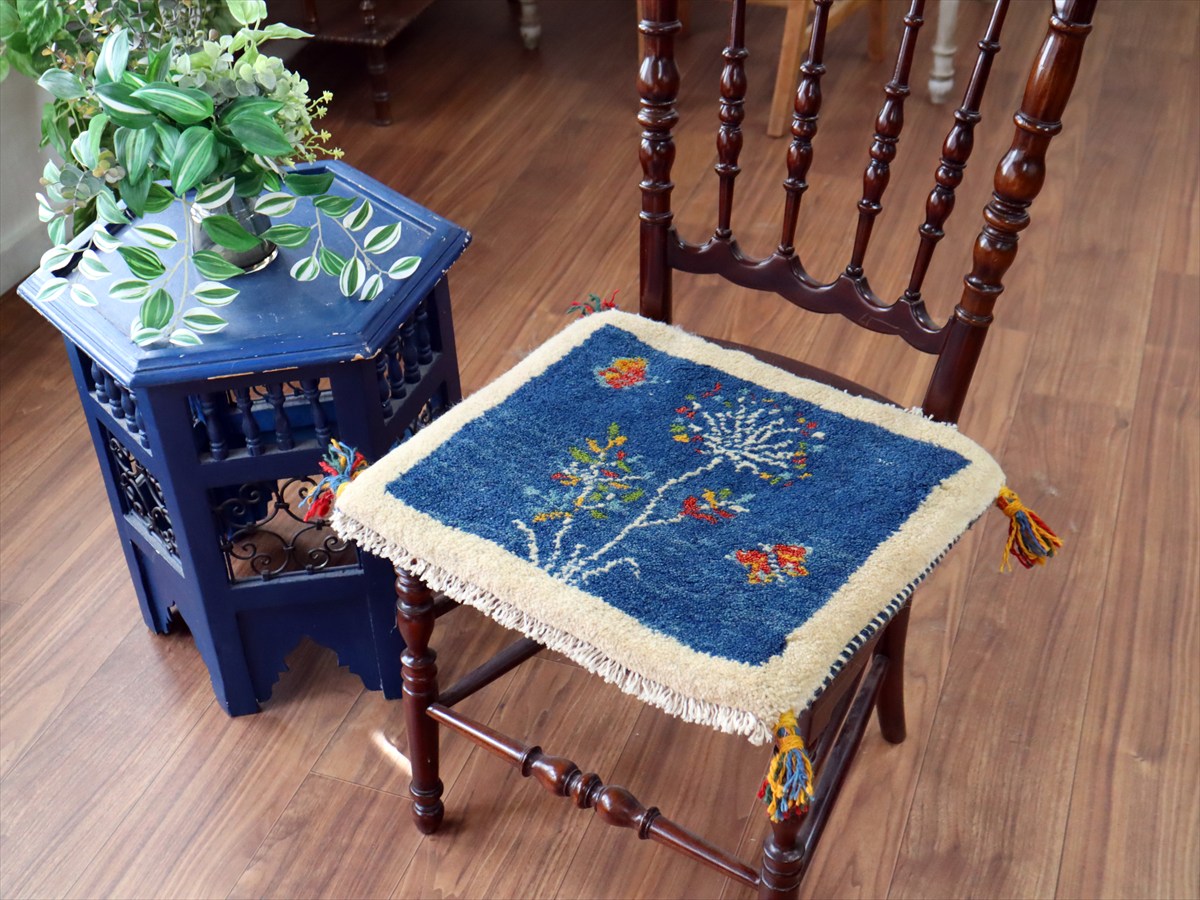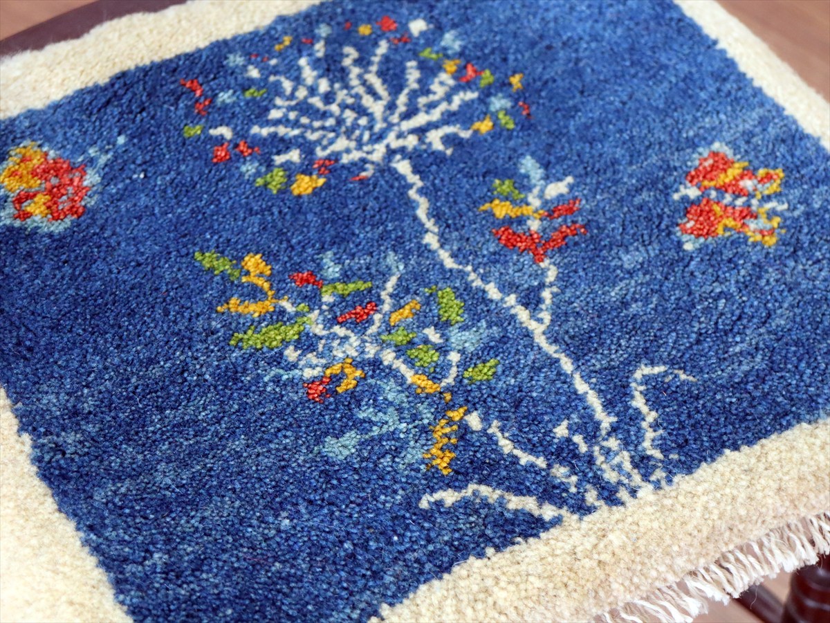 ギャッベ イラン産手織り 座布団サイズ 38×44cm ブルー 蝶々とフラワーデザイン