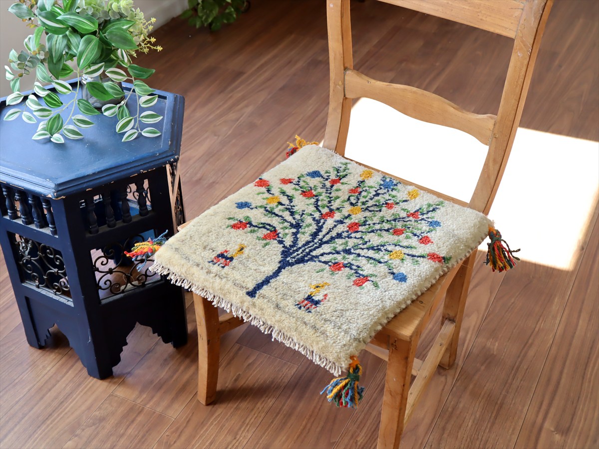- ギャッベ イラン産手織り 座布団サイズ 43×40cm ナチュラルアイボリー カラフルなザクロの樹と動物