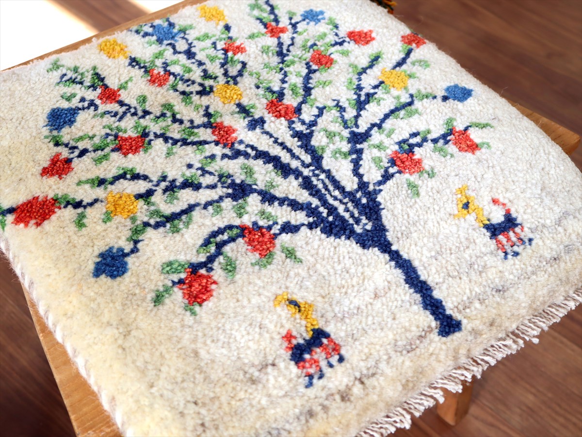 ギャッベ イラン産手織り 座布団サイズ 43×40cm ナチュラルアイボリー カラフルなザクロの樹と動物