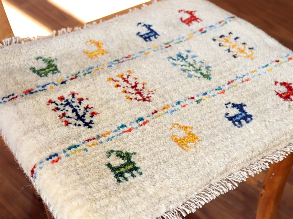 ギャッベ イラン産手織り 座布団サイズ 38×46cm ナチュラルアイボリー カラフルな生命の樹と動物