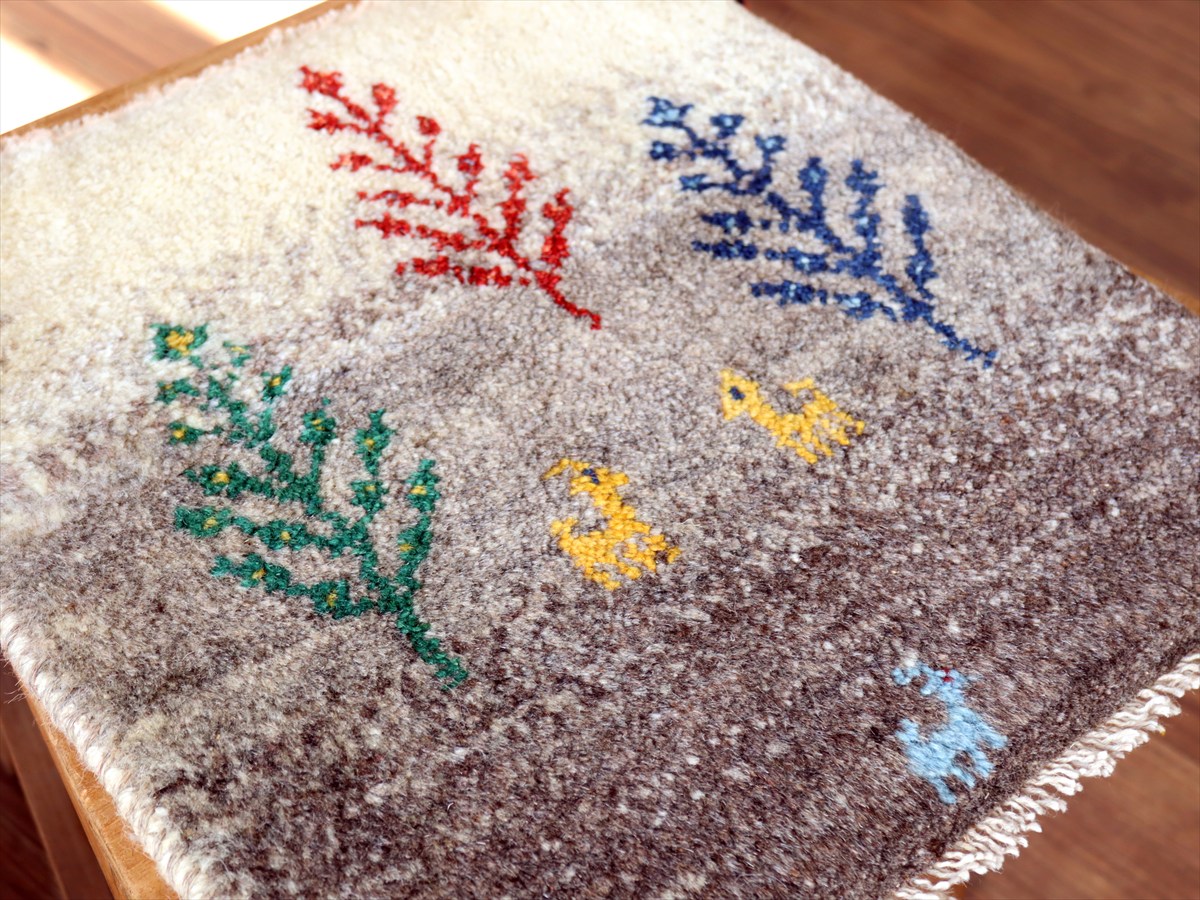 ギャッベ イラン産手織り 座布団サイズ 42×41cm ナチュラルアイボリー 生命の樹と動物