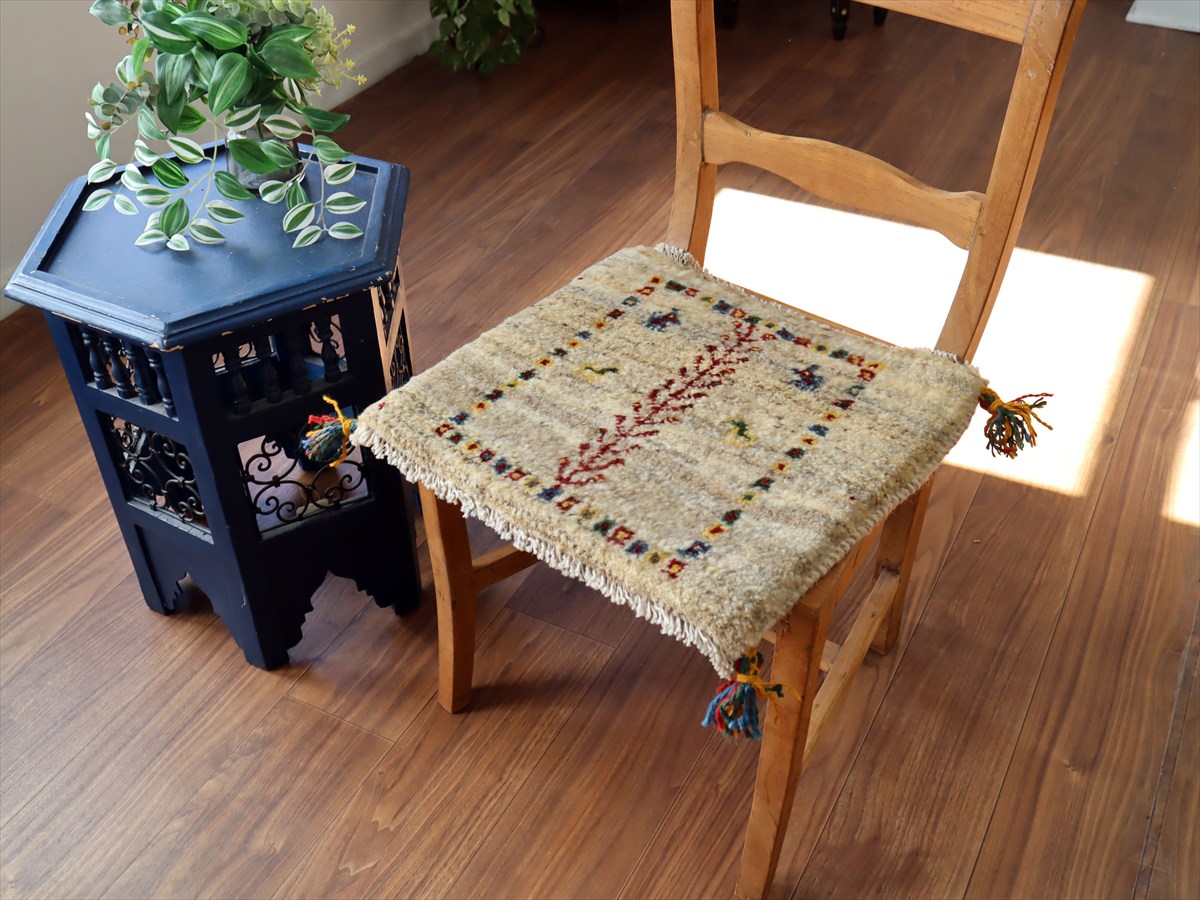 - ギャッベ イラン産手織り 座布団サイズ 40×43cm ナチュラルアイボリー 連なる生命の樹と動物