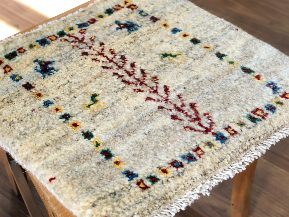 ギャッベ イラン産手織り 座布団サイズ 40×43cm ナチュラルアイボリー 連なる生命の樹と動物