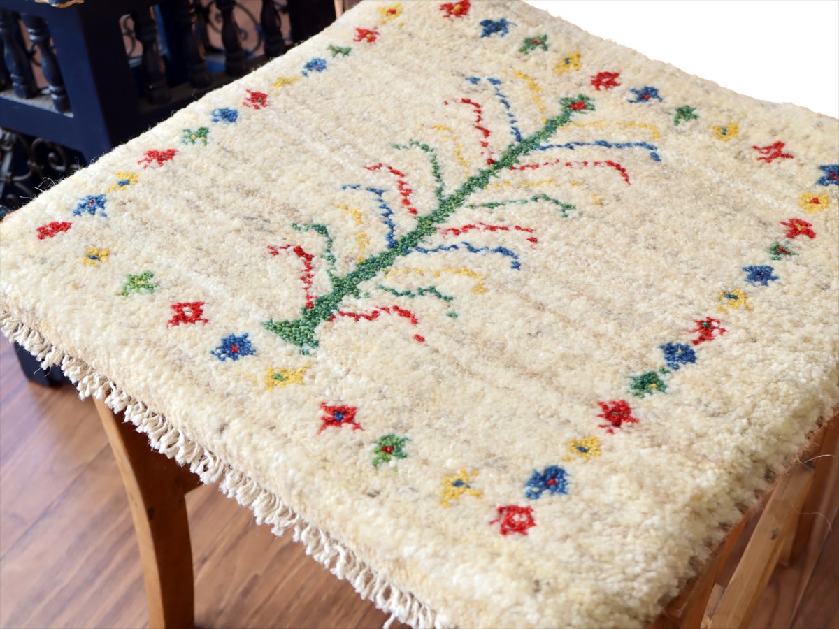 ギャッベ イラン産手織り 座布団サイズ 40×42cm ナチュラルアイボリー カラフルな連なる生命の樹