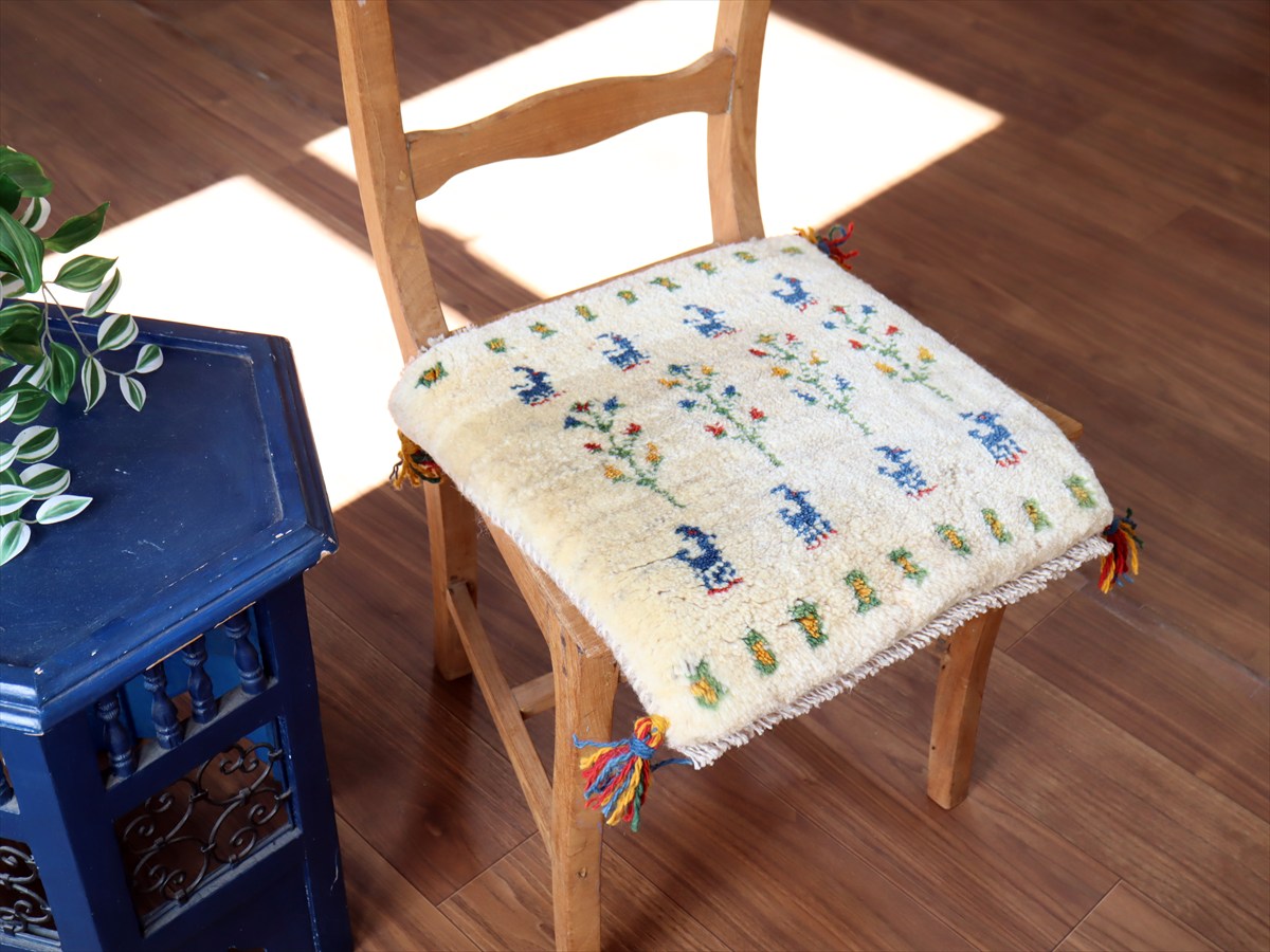 - ギャッベ イラン産手織り 座布団サイズ 42×40cm ナチュラルアイボリー カラフルな生命の樹と動物