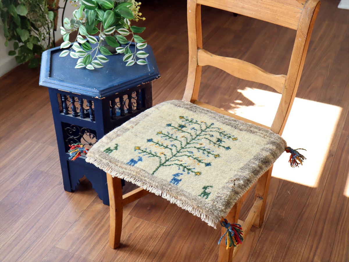 ギャッベ イラン産手織り 座布団サイズ 39×43cm ナチュラルアイボリー 生命の樹と動物