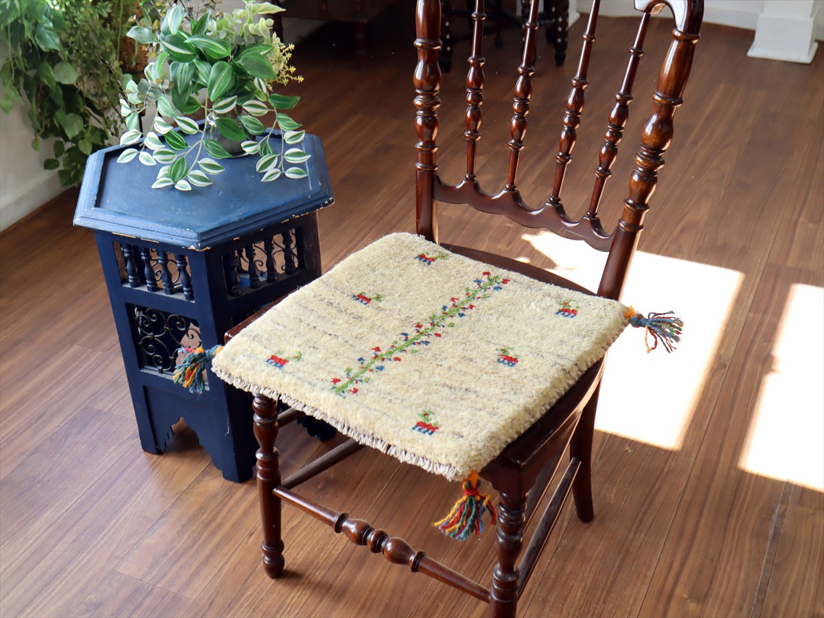 - ギャッベ イラン産手織り 座布団サイズ 39×40cm ナチュラルアイボリー 連なる生命の樹と動物