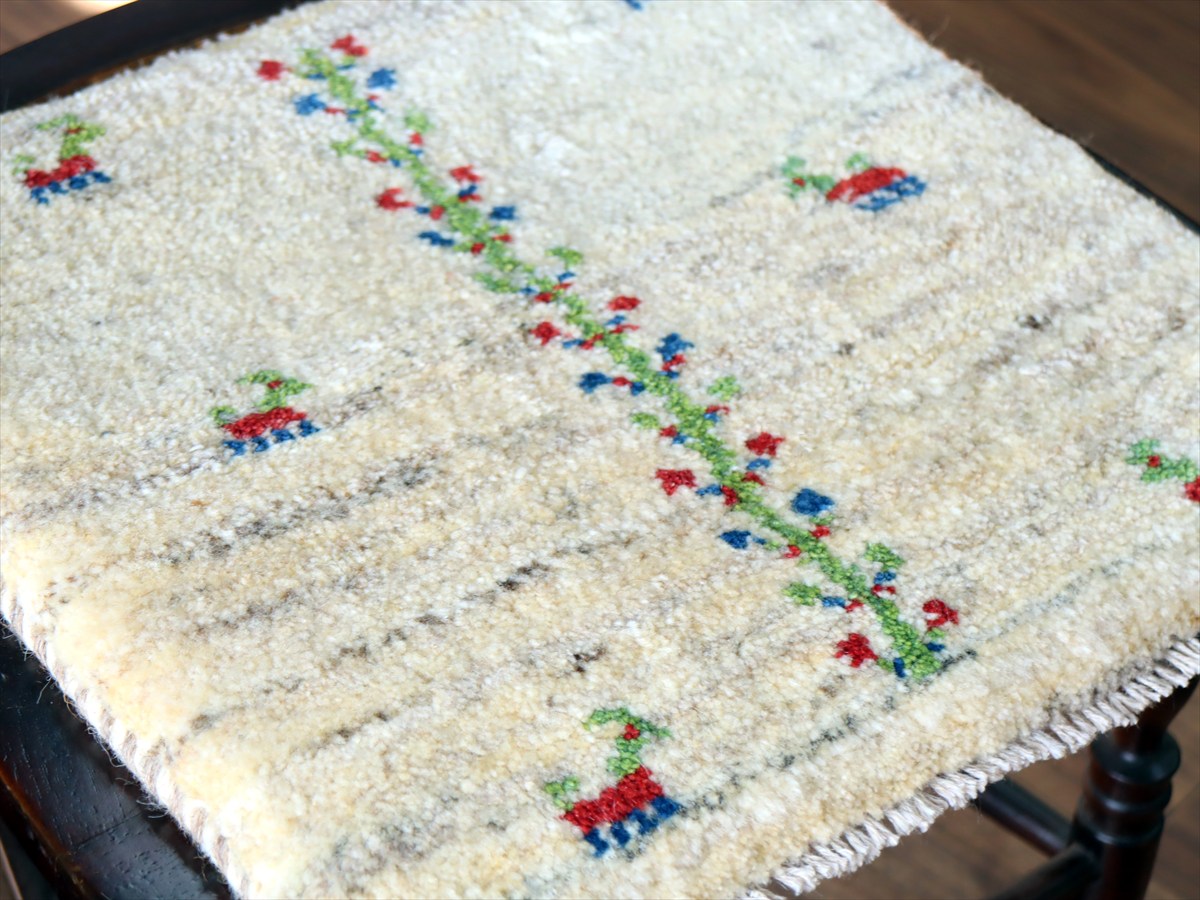 ギャッベ イラン産手織り 座布団サイズ 39×40cm ナチュラルアイボリー 連なる生命の樹と動物