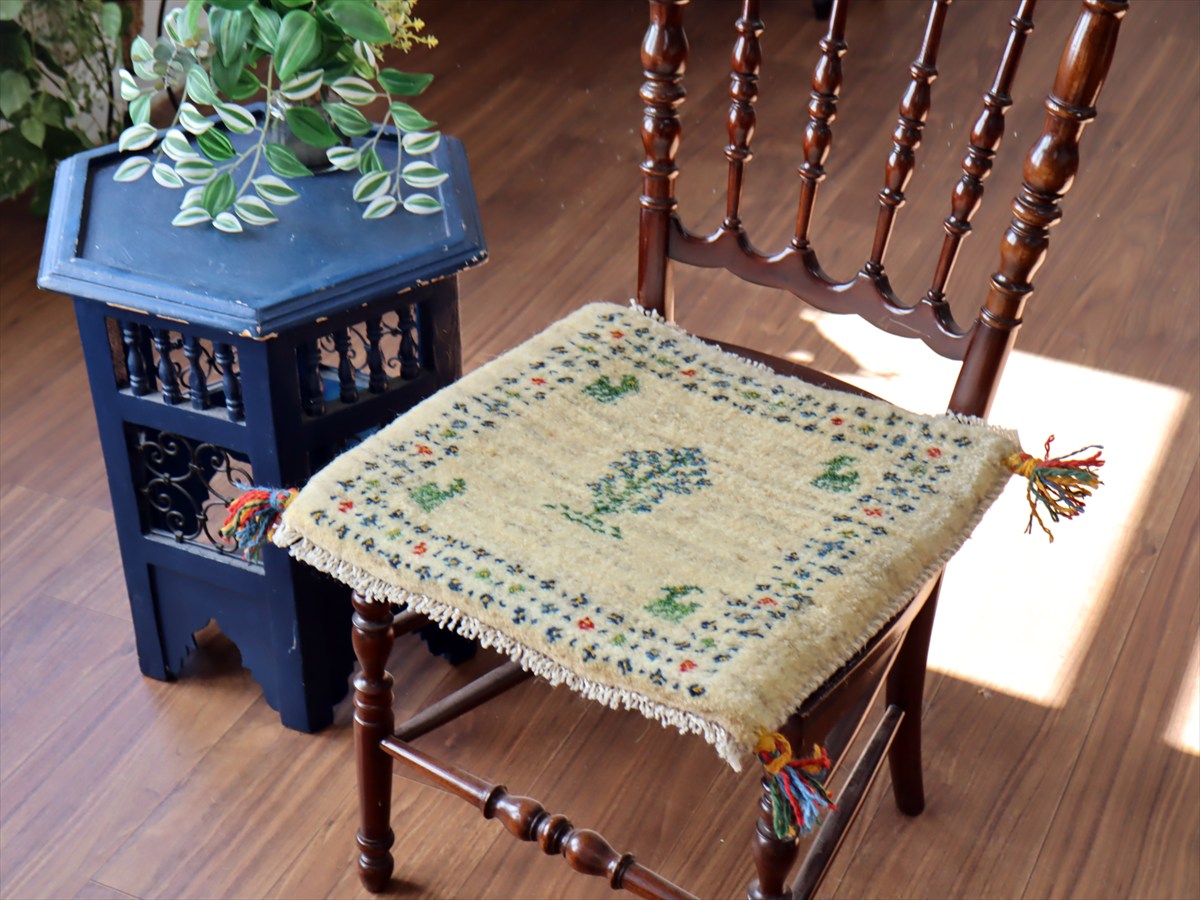 ギャッベ イラン産手織り 座布団サイズ 39×43cm ナチュラルアイボリー 生命の樹と動物