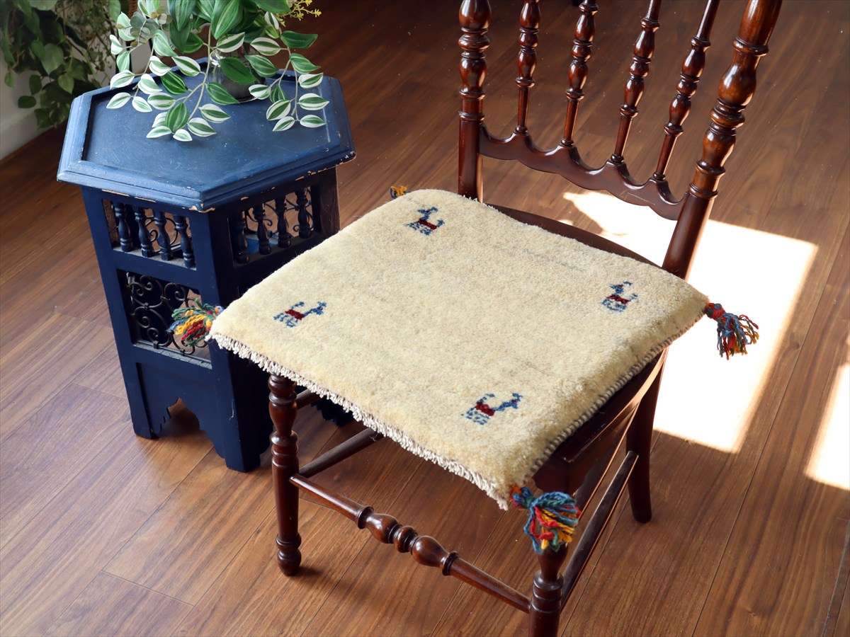 ギャッベ イラン産手織り 座布団サイズ 40×43cm ナチュラルアイボリー 動物モチーフ