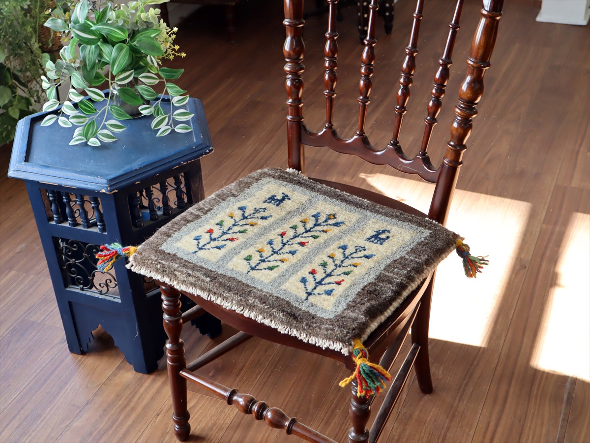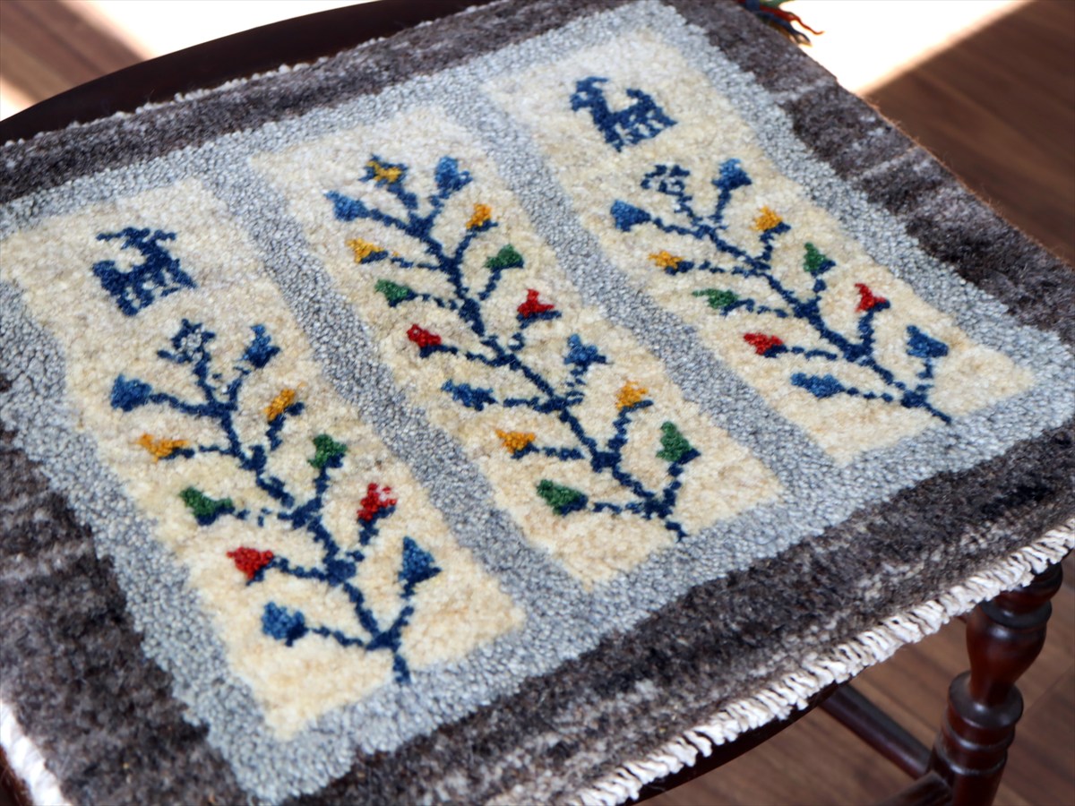 ギャッベ イラン産手織り 座布団サイズ 36×44cm ナチュラルアイボリー 生命の樹と動物