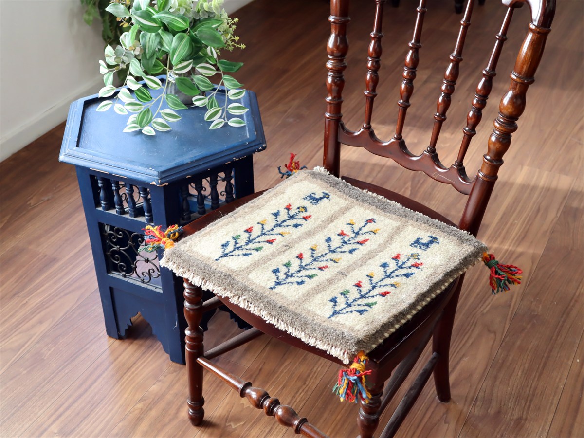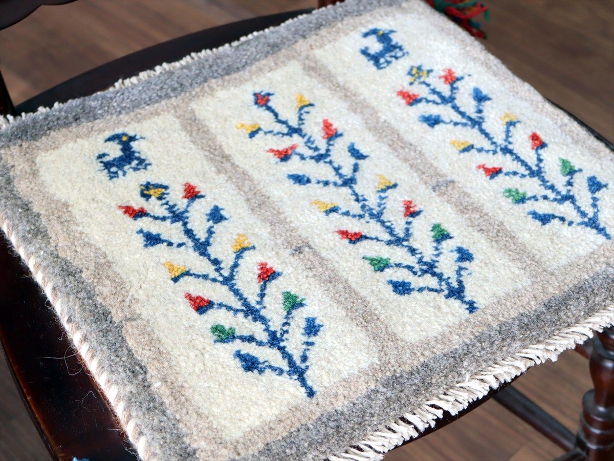 - ギャッベ イラン産手織り 座布団サイズ 36×39cm ナチュラルアイボリー カラフルな連なる生命の樹と動物