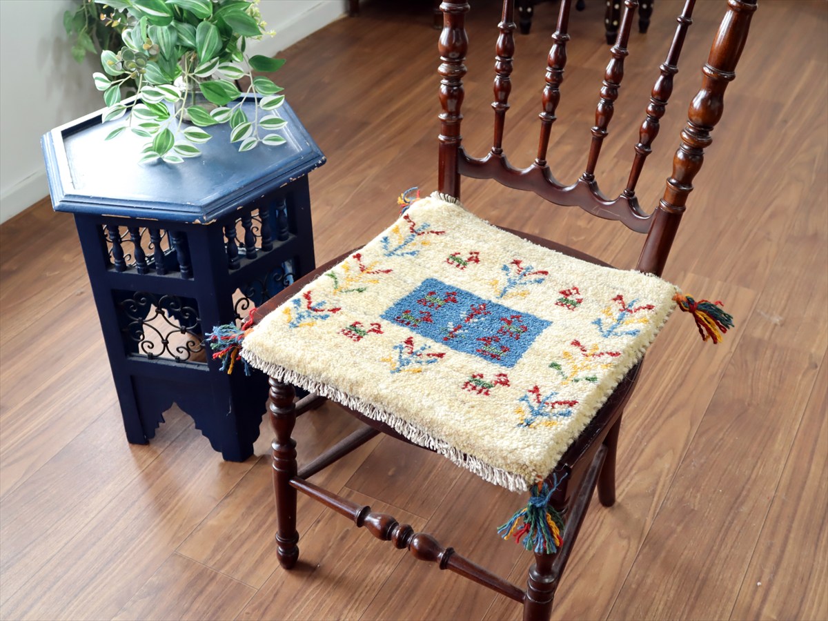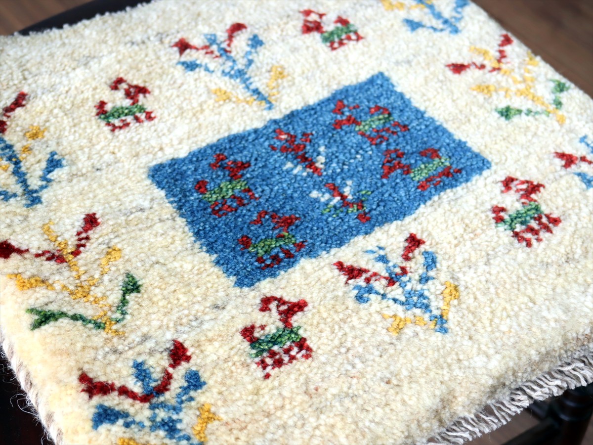 ギャッベ イラン産手織り 座布団サイズ 38×40cm ナチュラルアイボリー カラフルな生命の樹と動物