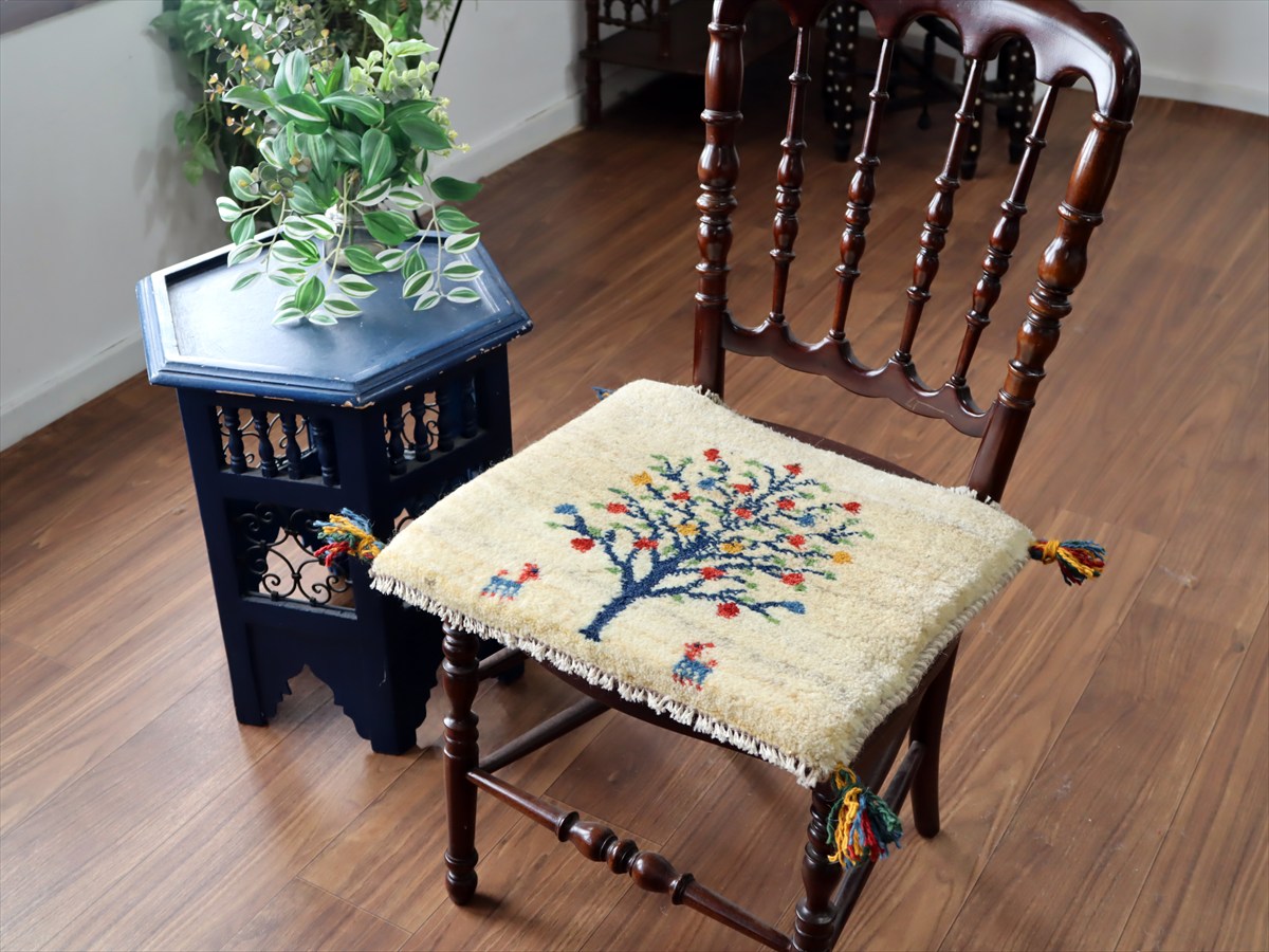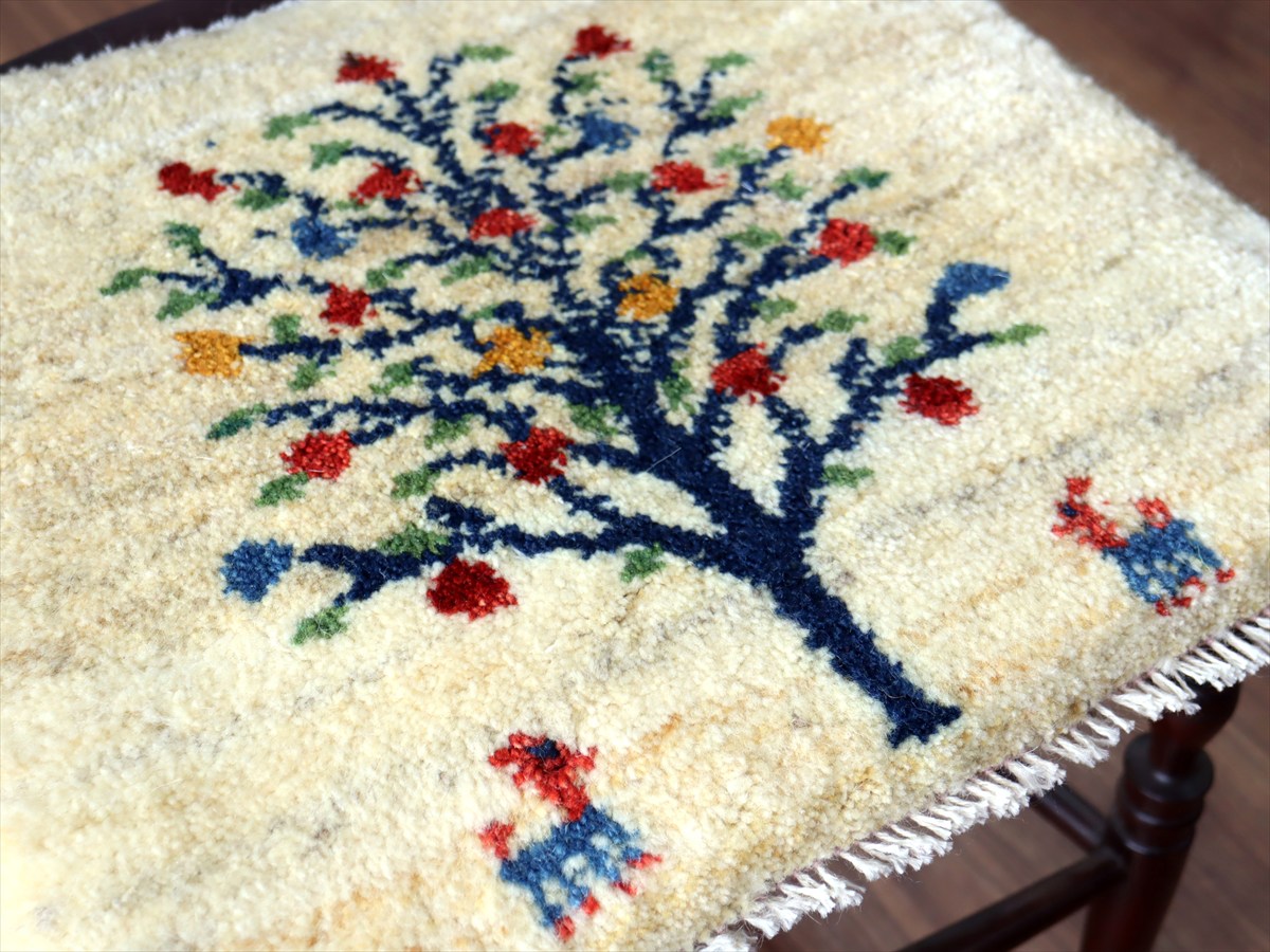 ギャッベ イラン産手織り 座布団サイズ 39×45cm ナチュラルアイボリー カラフルなザクロの樹と動物